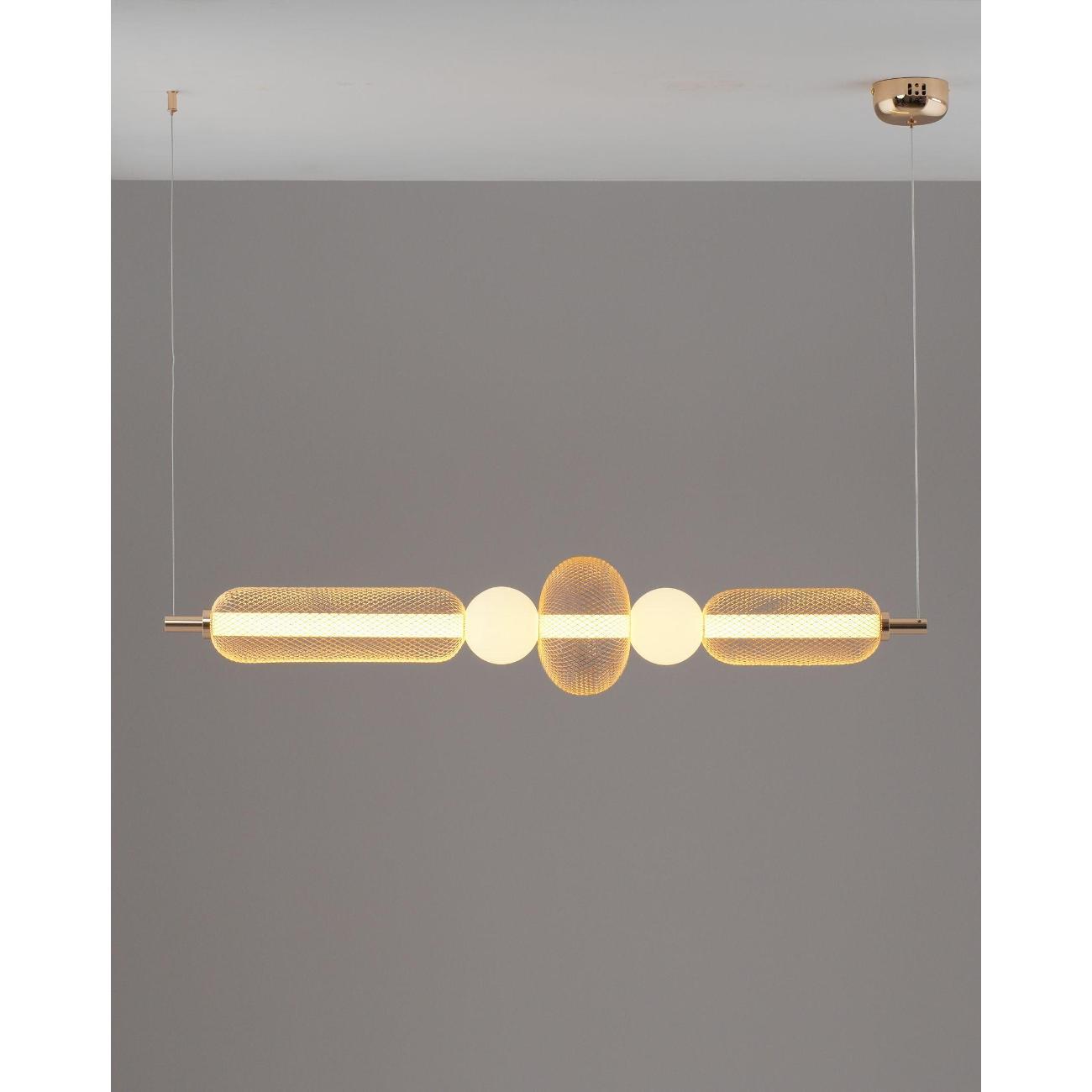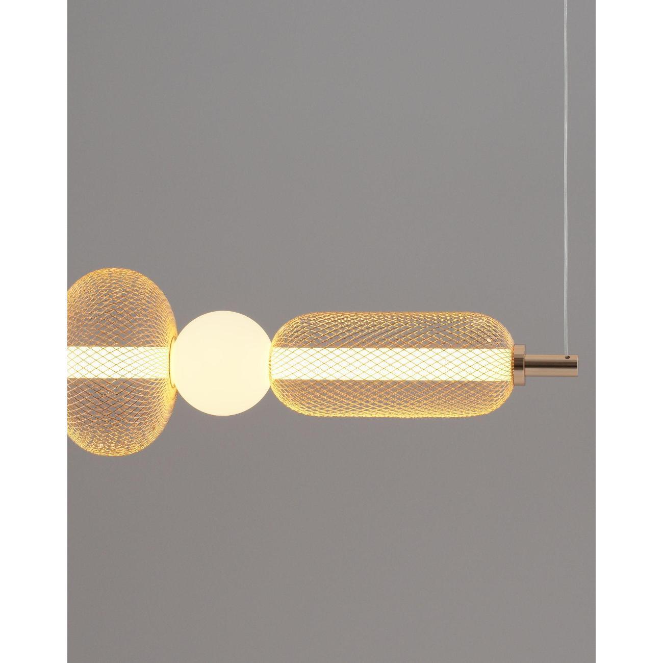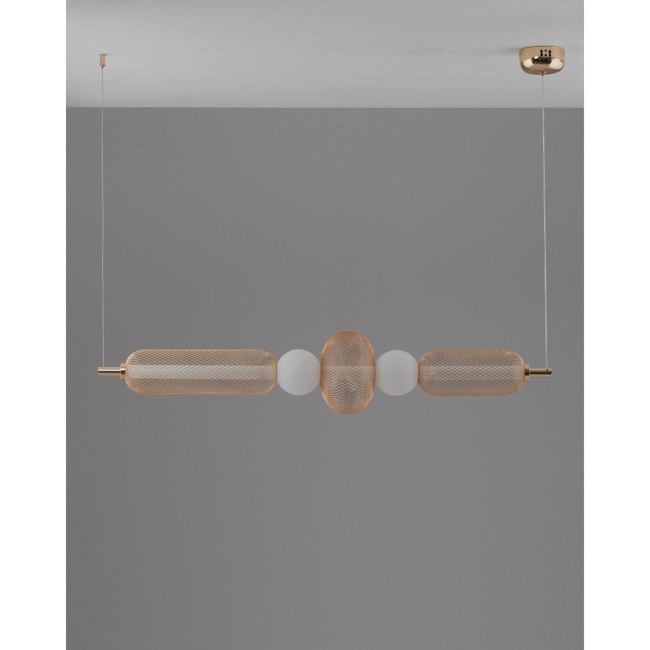 Современный стиль и изысканный дизайн. Светильник выполнен в стиле лофт и состоит из золотистого металлического корпуса с глянцевым покрытием, который гармонично сочетается с белыми акриловыми плафонами. Сетчатая конструкция корпуса придает светильнику индустриальный вид, а плафоны в форме шаров создают мягкий и теплый свет, идеально подходящий для уютных интерьеров. Золотая арматура и подвесной шнур подчеркивают современность и функциональность дизайна.