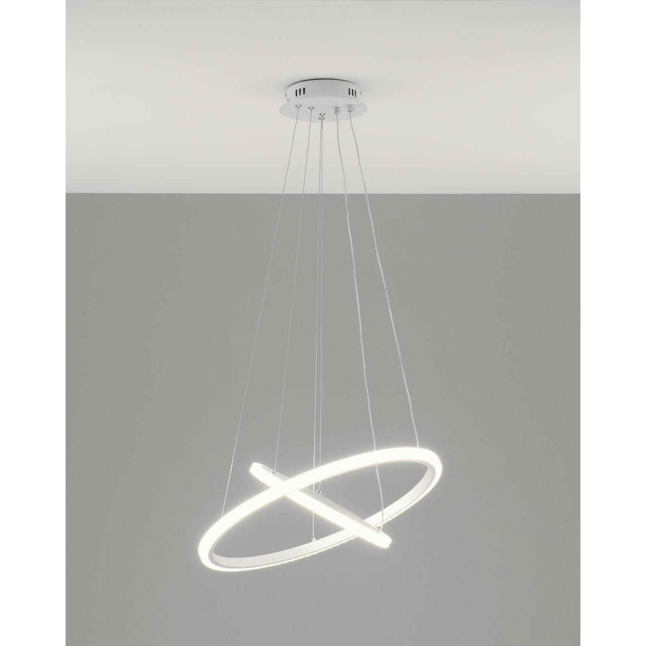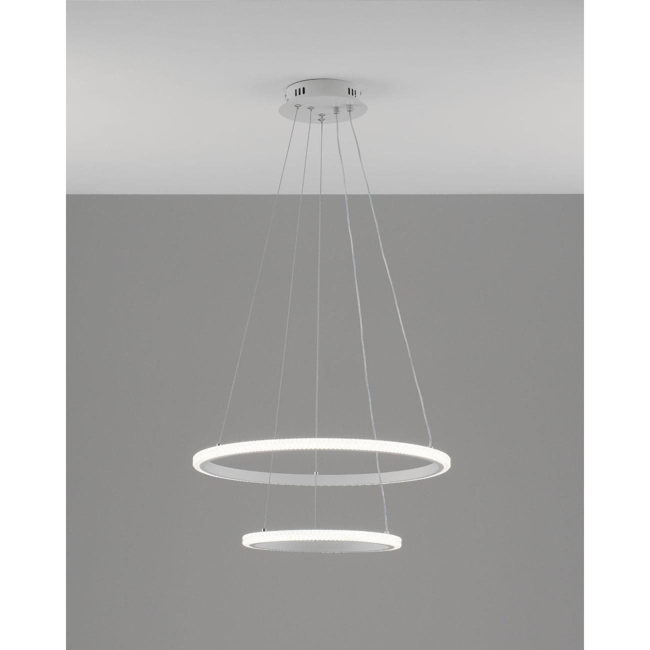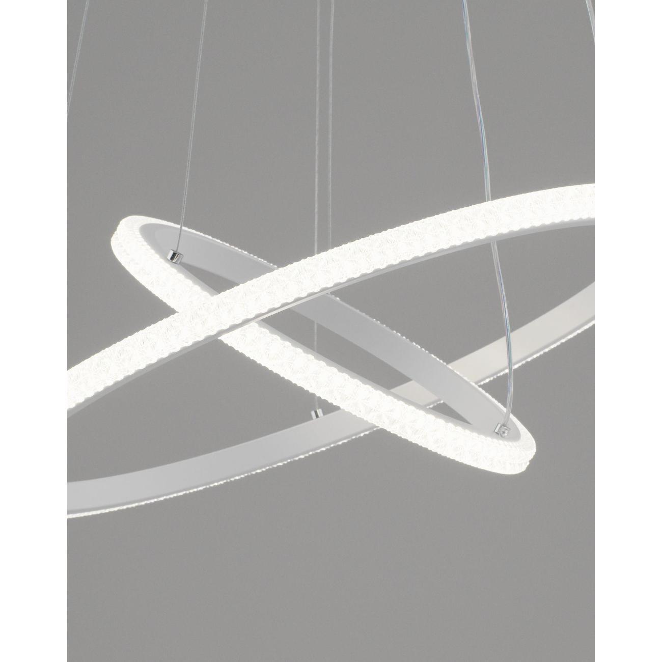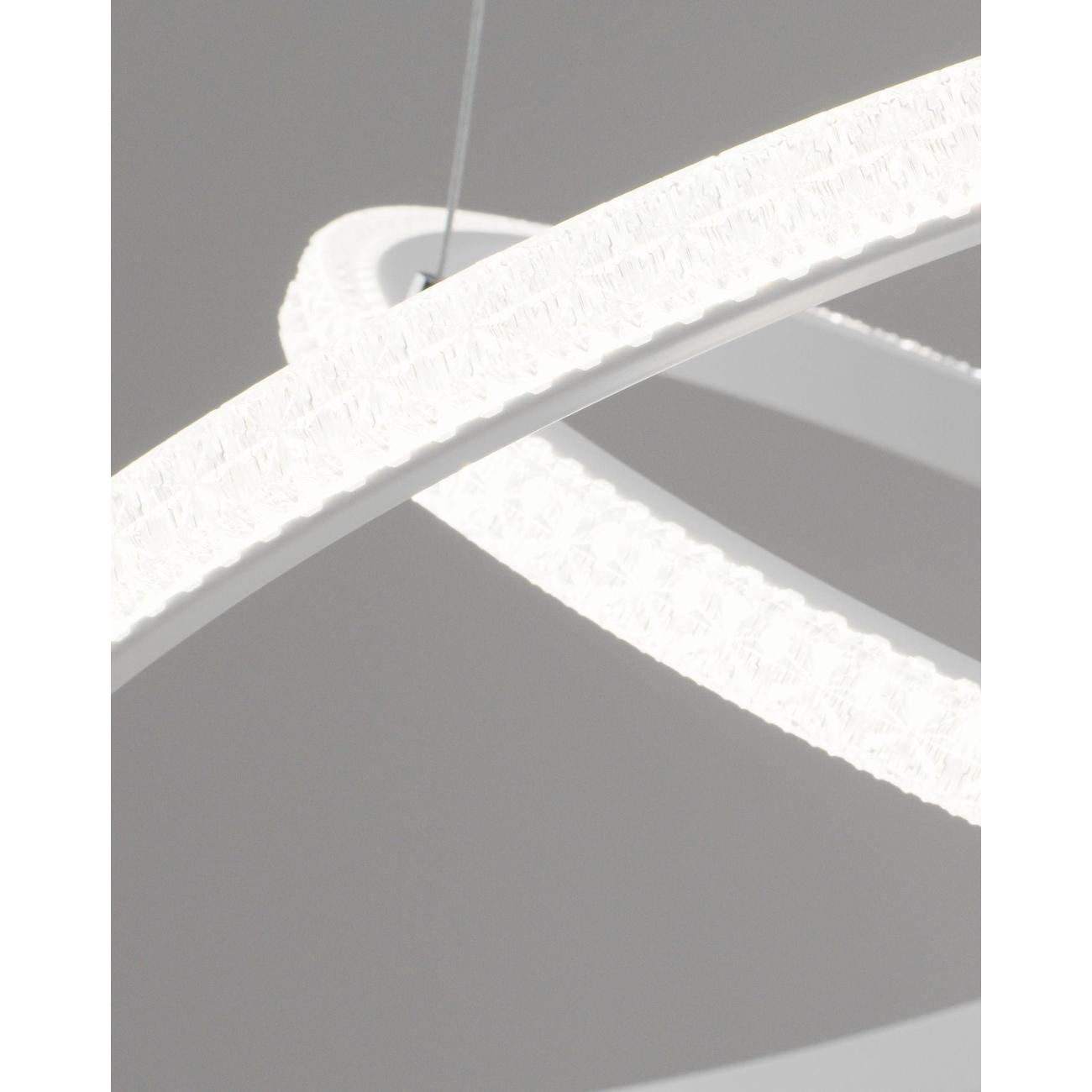 Светильник сочетает в себе стиль хай-тек и утонченный дизайн. Белый матовый корпус с и белые плафоны из прочного PVC в виде двух светящихся колец, расположенных на разных уровнях, создают динамичную и современную композицию. Его уникальная конструкция из подвешенных элементов не только украсит интерьер, но и обеспечит равномерное освещение площади.