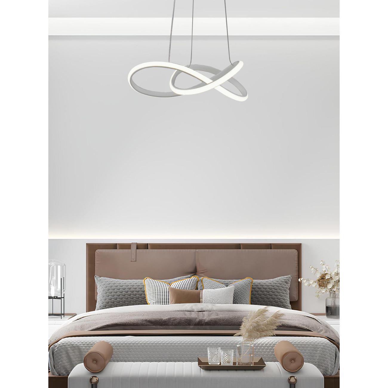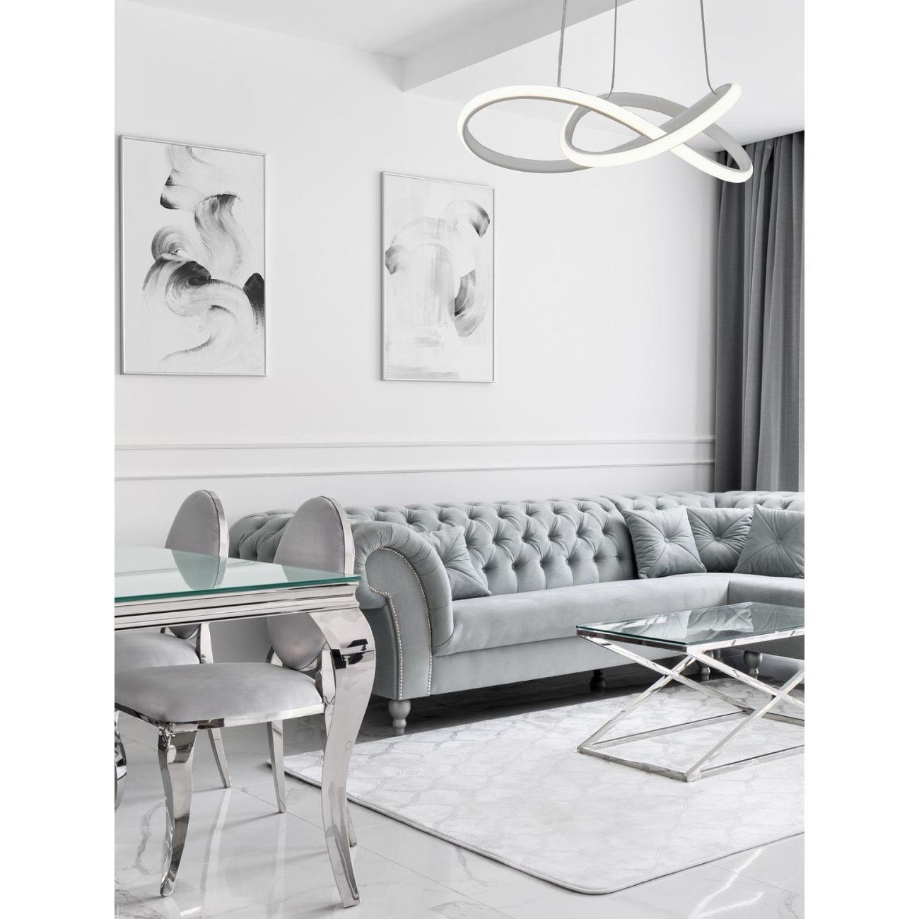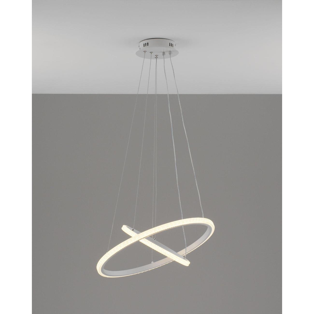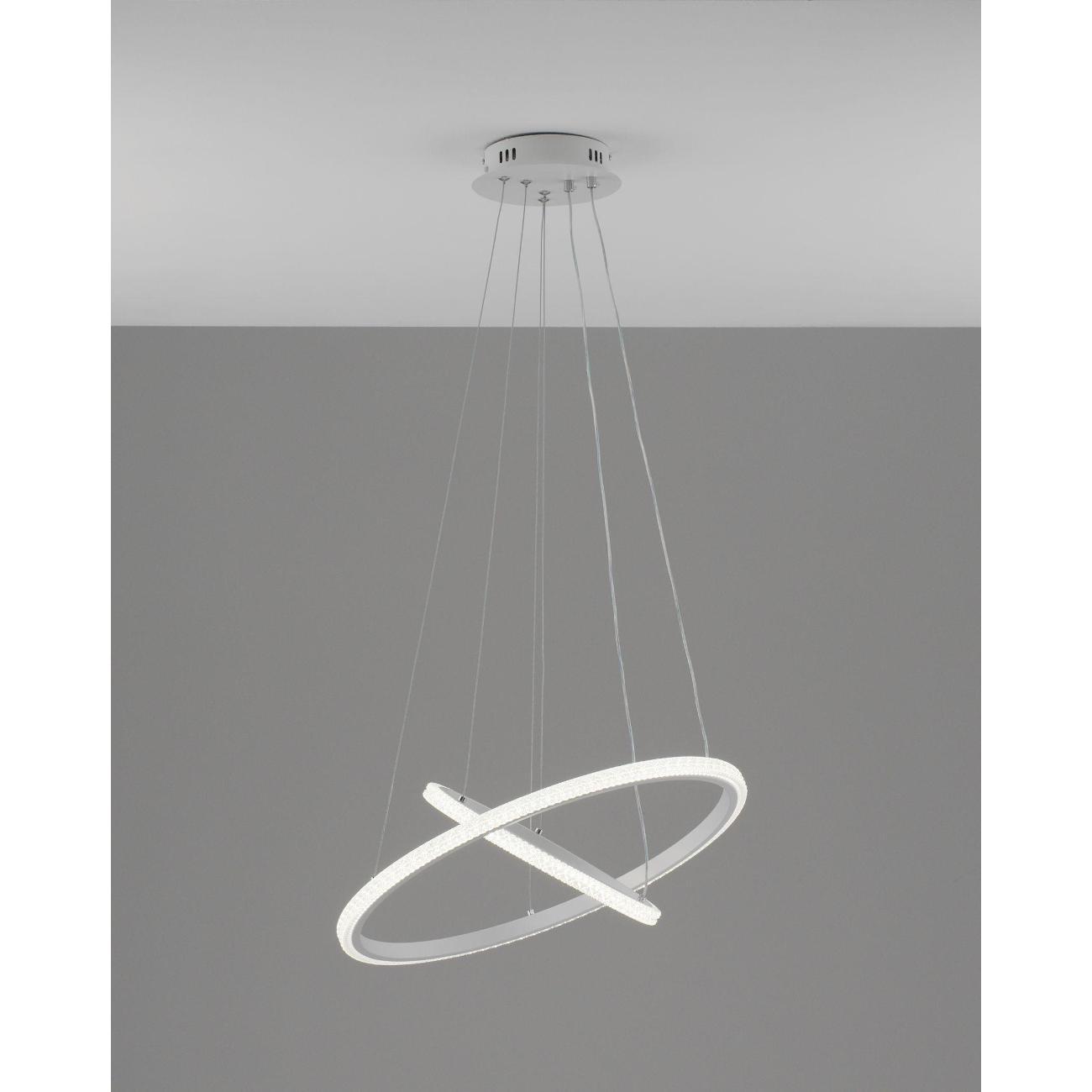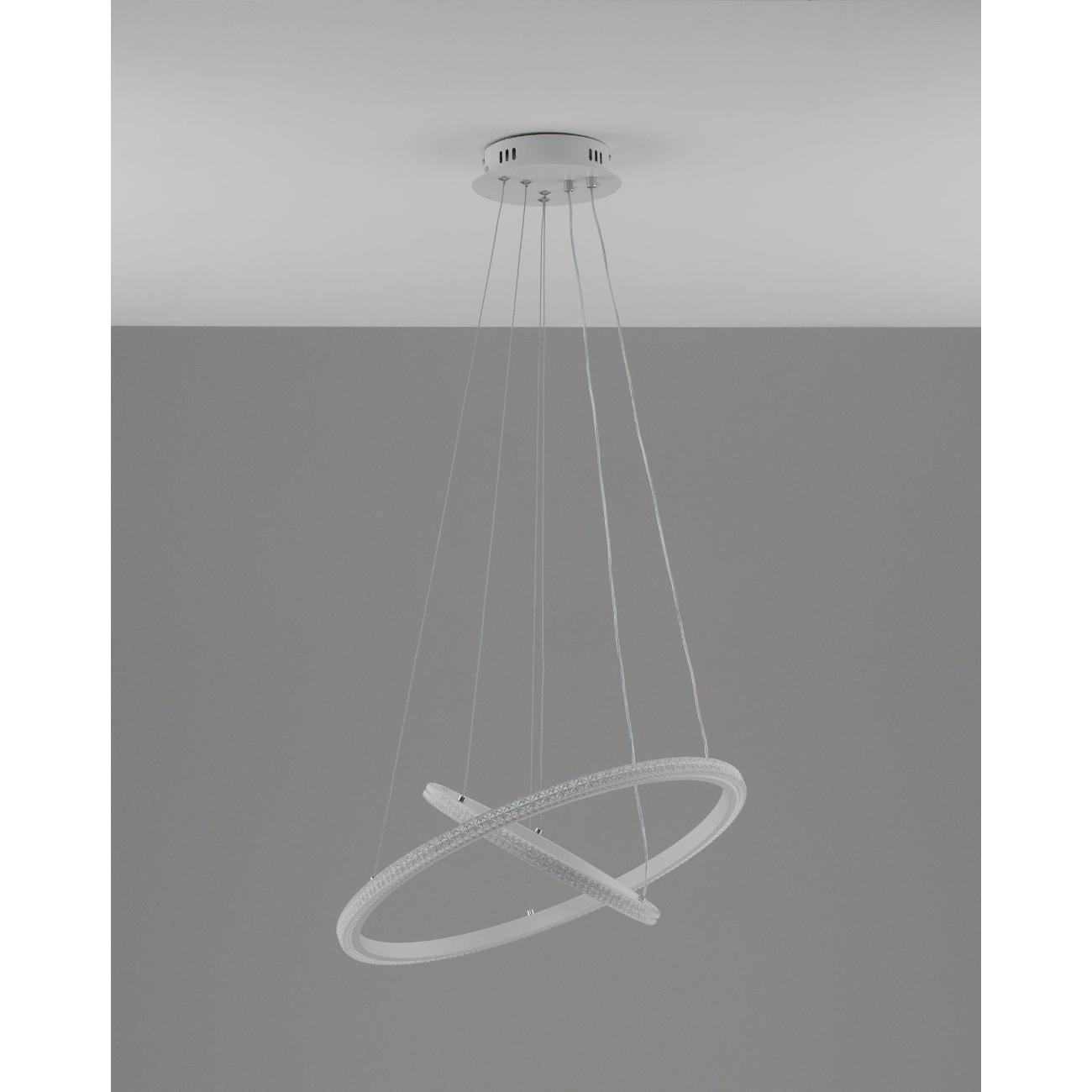Светильник сочетает в себе стиль хай-тек и утонченный дизайн. Белый матовый корпус с и белые плафоны из прочного PVC в виде двух светящихся колец, расположенных на разных уровнях, создают динамичную и современную композицию. Его уникальная конструкция из подвешенных элементов не только украсит интерьер, но и обеспечит равномерное освещение площади.