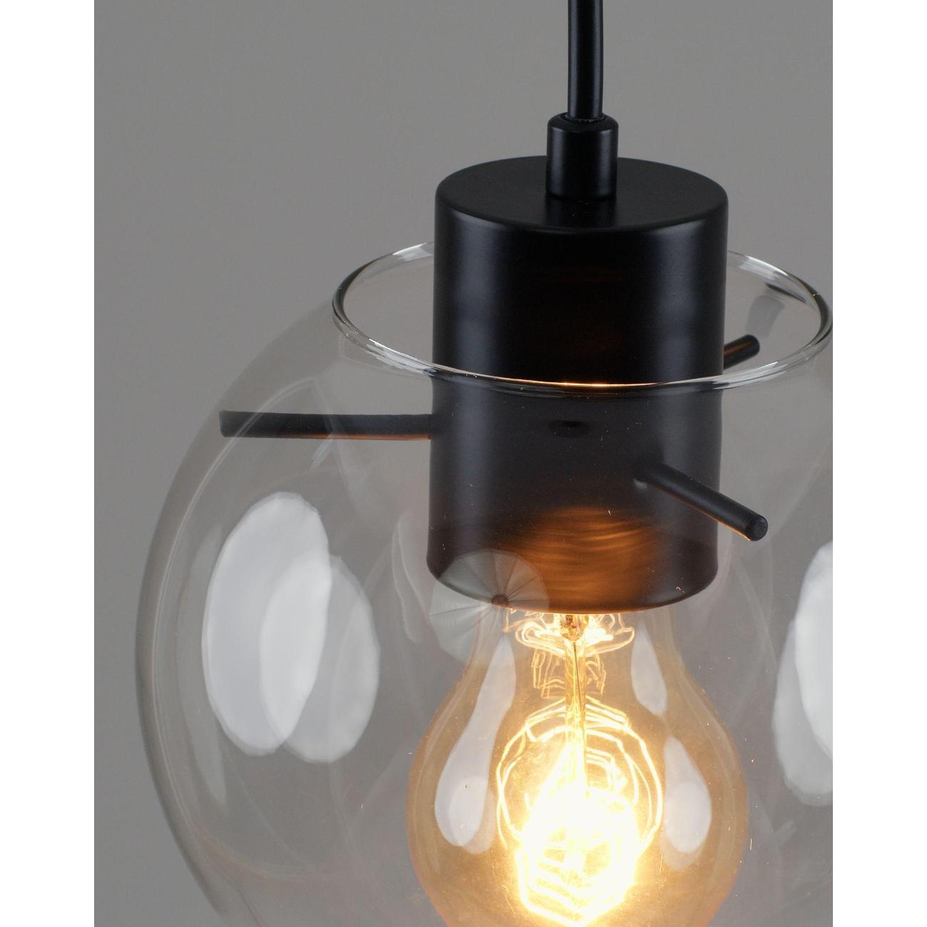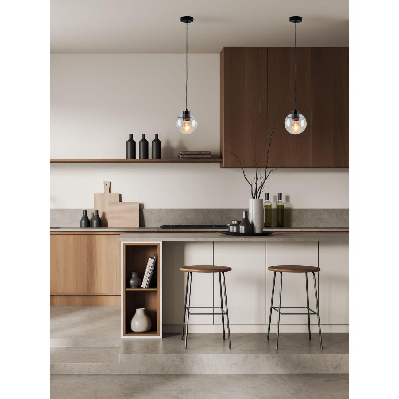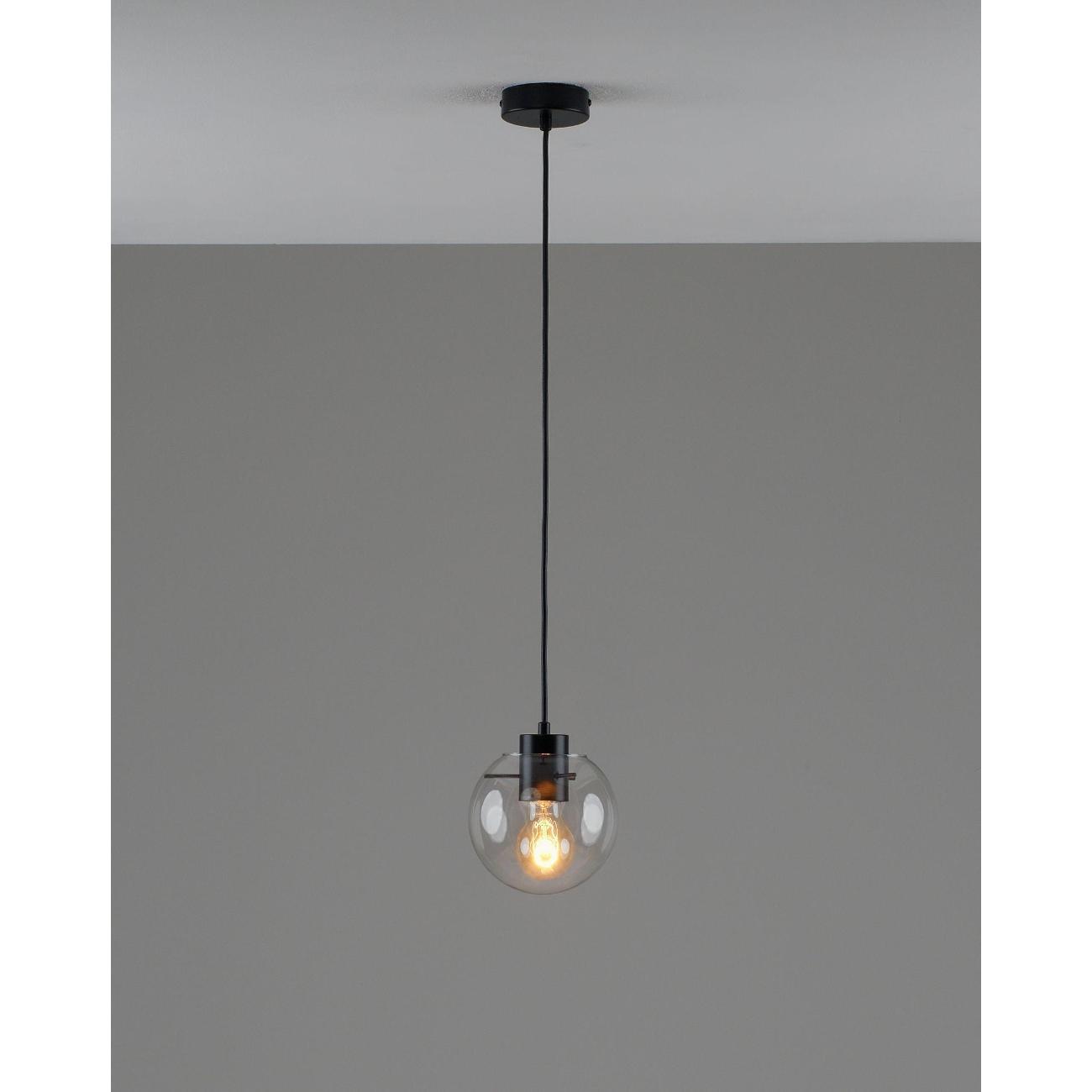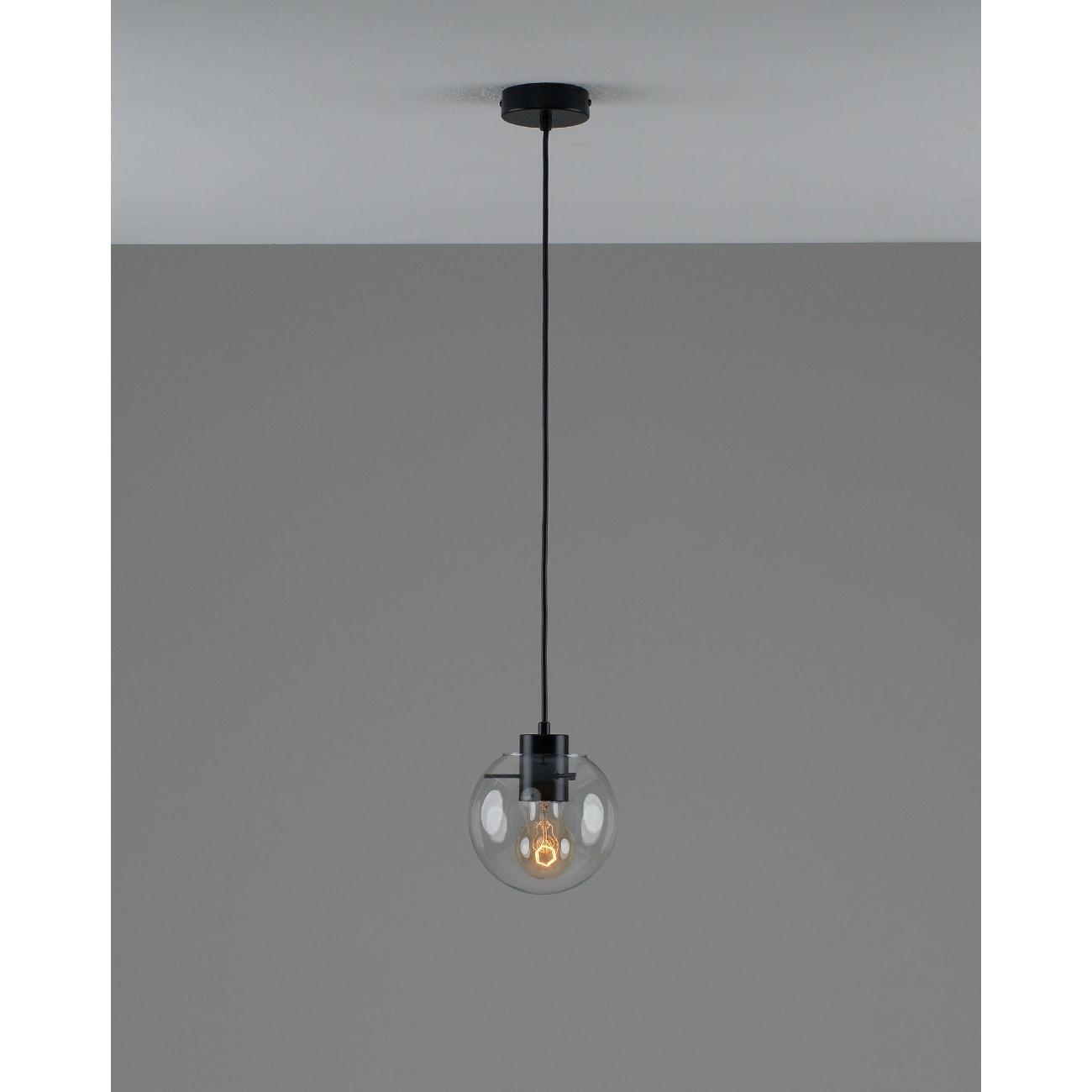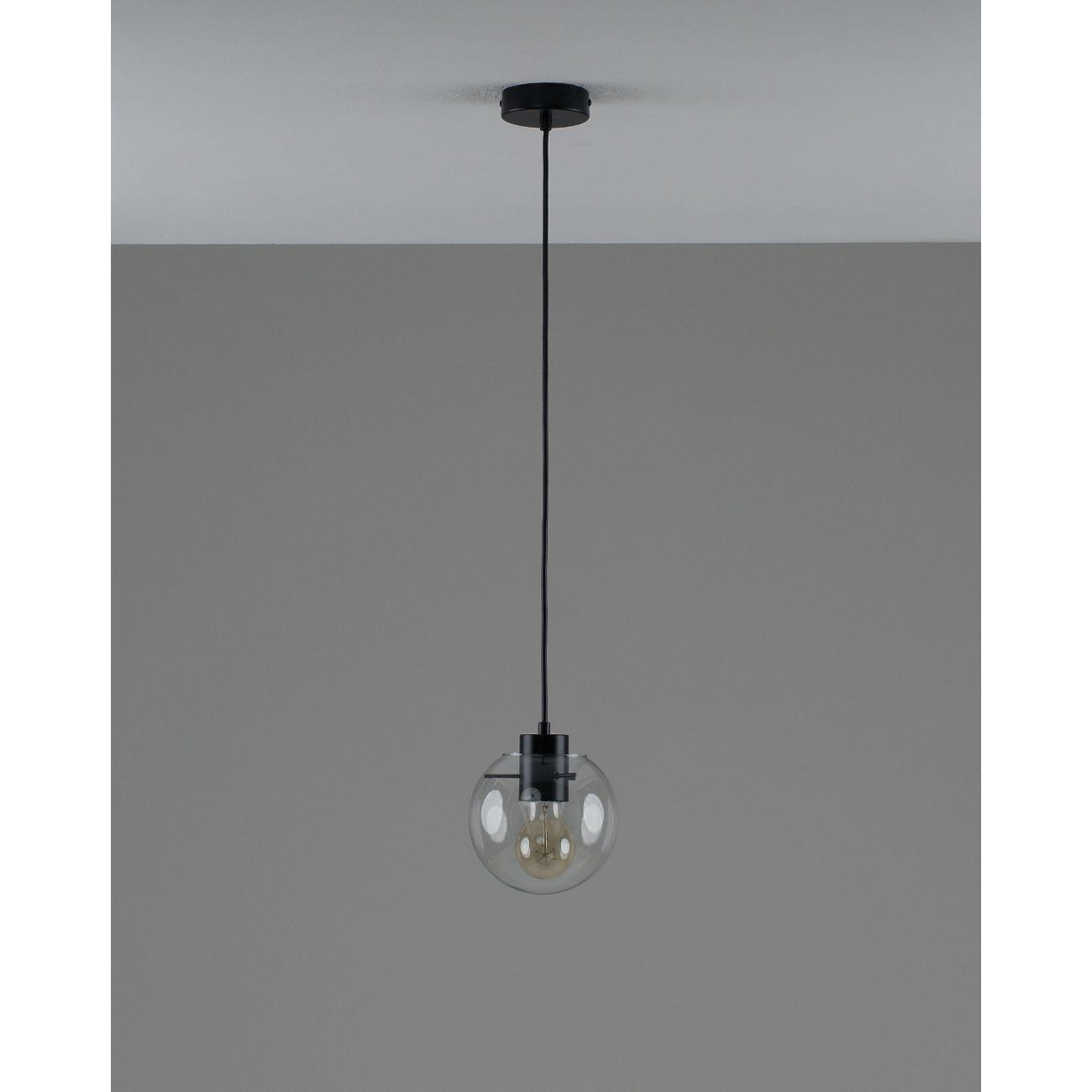 Подвесной светильник шар Moderli V11537-1P Aurora в современном стиле с плафоном из прозрачного стекла и арматурой черного цвета. Диаметр стеклянного плафона 15 см, в качестве источника света могут быть использованы лампы накаливания или LED с цоколем Е27.