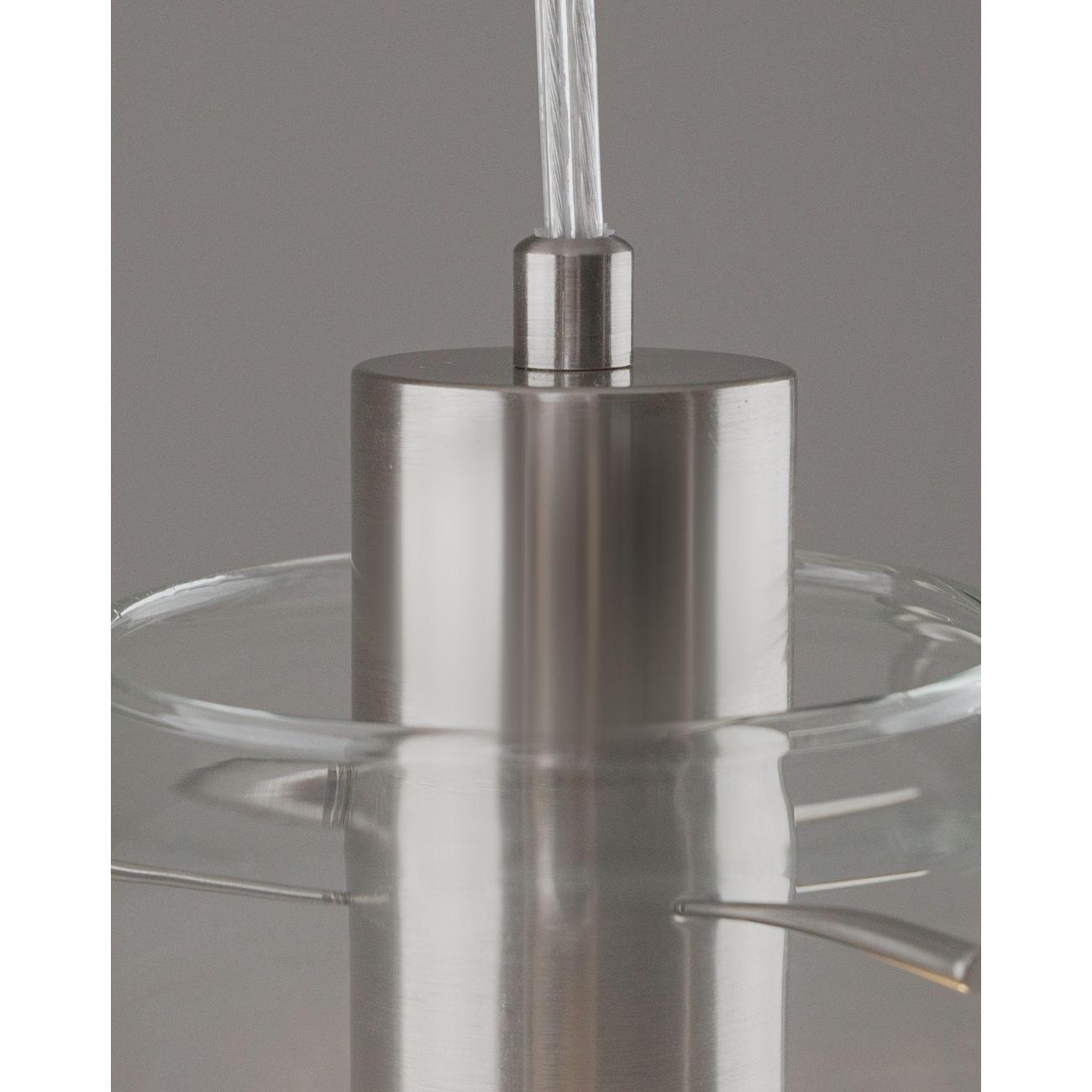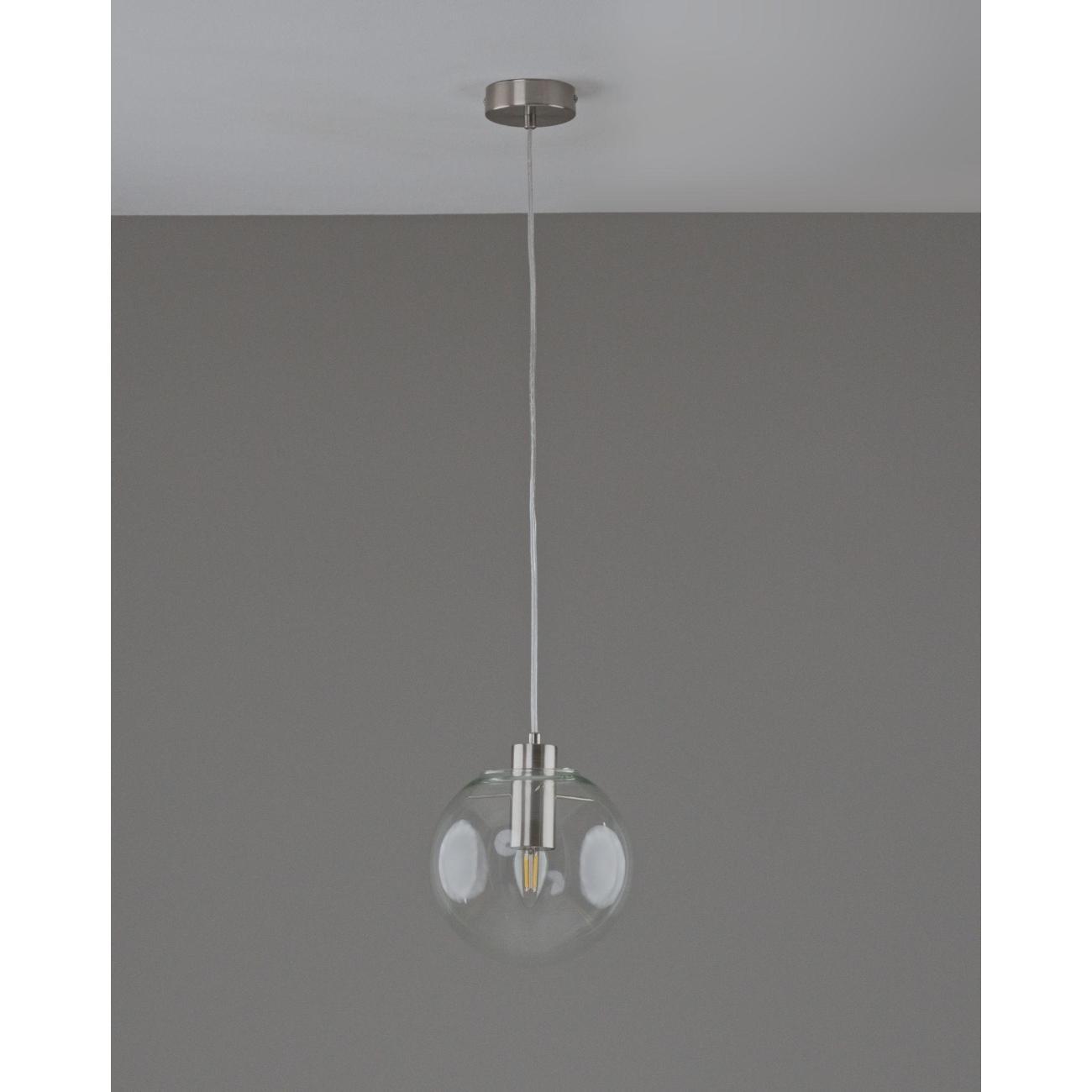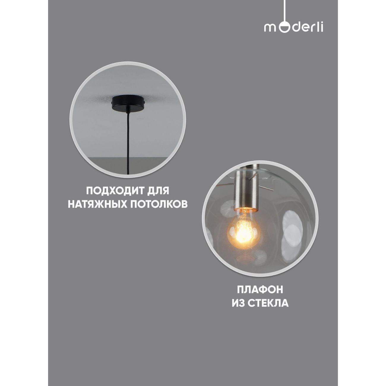 Moderli V11544-1P Aurora. Подвесной светильник в современном стиле с плафоном из прозрачного стекла и арматурой цвета матовый хром. Диаметр стеклянного плафона 20 см, в качестве источника света могут быть использованы лампы накаливания или LED с цоколем Е27.