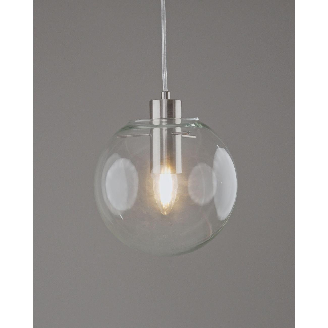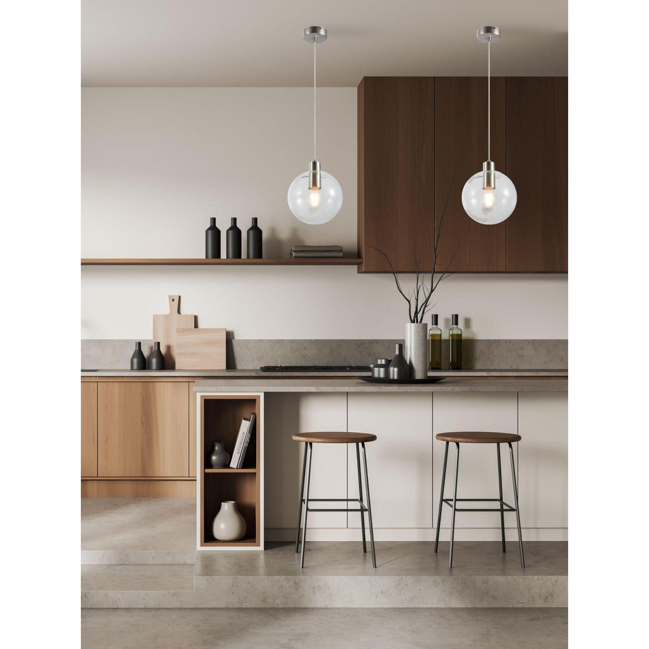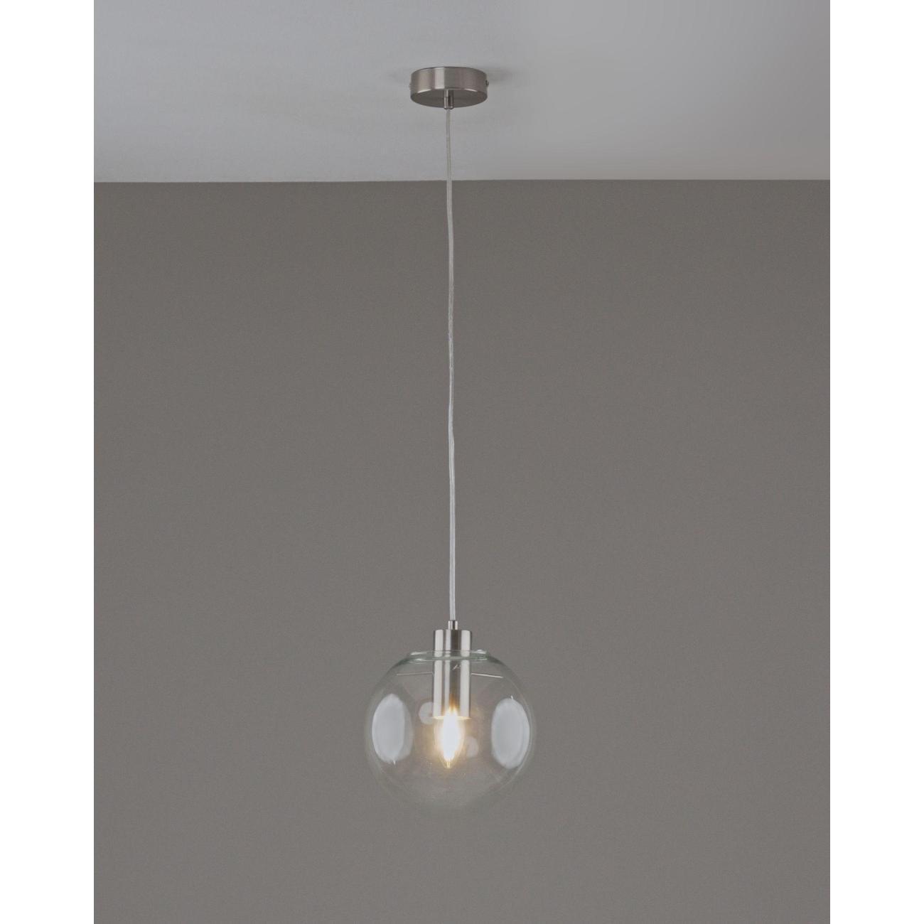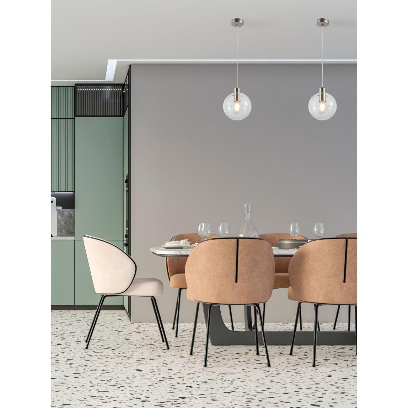 Moderli V11544-1P Aurora. Подвесной светильник в современном стиле с плафоном из прозрачного стекла и арматурой цвета матовый хром. Диаметр стеклянного плафона 20 см, в качестве источника света могут быть использованы лампы накаливания или LED с цоколем Е27.