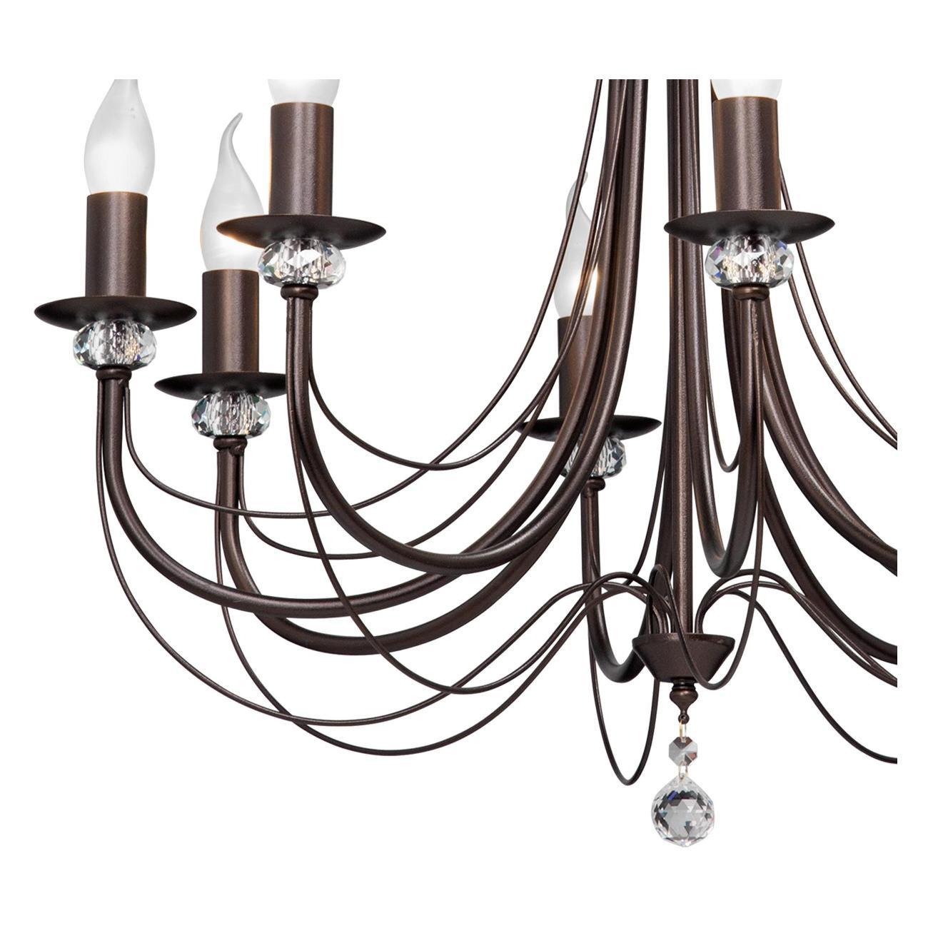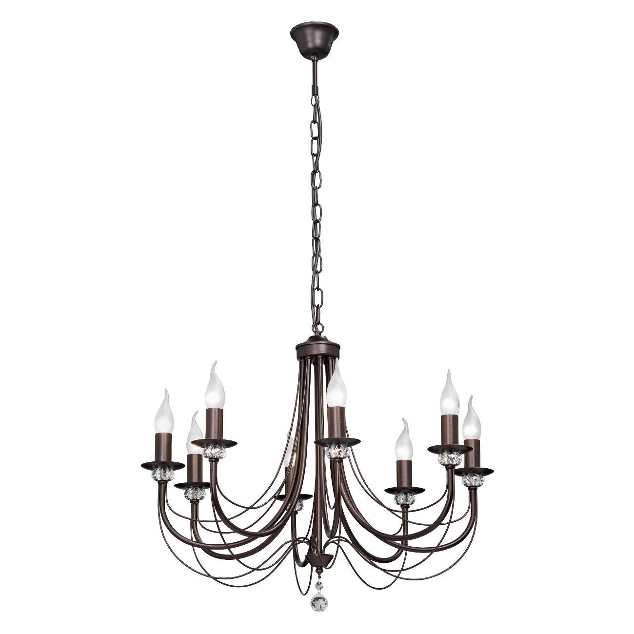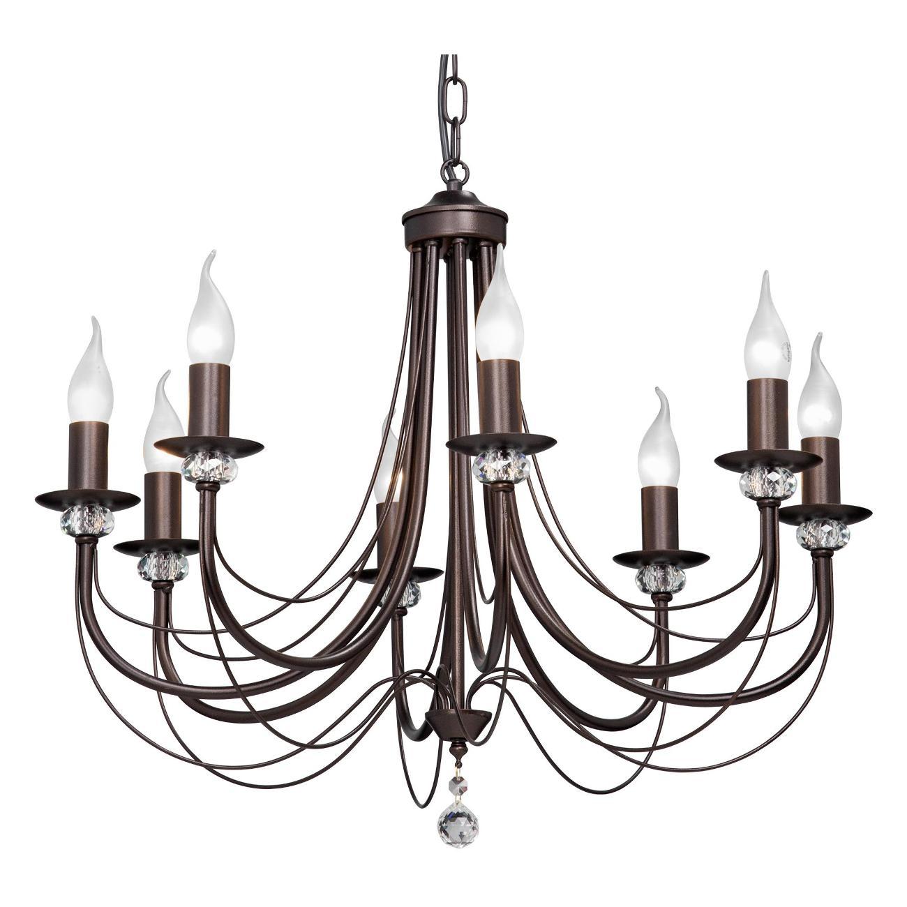 Люстра имеет 8 ламп с цоколем E14 и мощностью 60 Вт каждая. Площадь освещения составляет 24 м2.