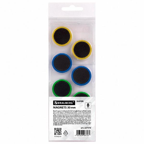 Диаметр магнитов составляет 30 мм. 8 штук в комплекте. Надежно удерживаются на любой железной или стальной поверхности. Магниты BRAUBERG "SUPER" отличаются повышенной удерживающей магнитной силой. Магниты круглой формы выполнены из пластика цветов ассорти. Поставляются в прозрачном пластиковом боксе с европодвесом.