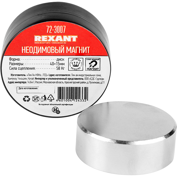 Неодимовый магнит Rexant с силой сцепления 58 кг предназначен для использования в разных сферах – медицине, промышленности, быту. Он представляет собой сплав железа, бора и редкоземельного элемента неодима. При этом образуется упорядоченная кристаллическая структура, обладающая огромной силой притяжения и высокой стойкостью к размагничиванию.