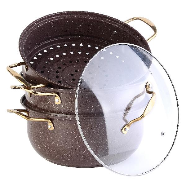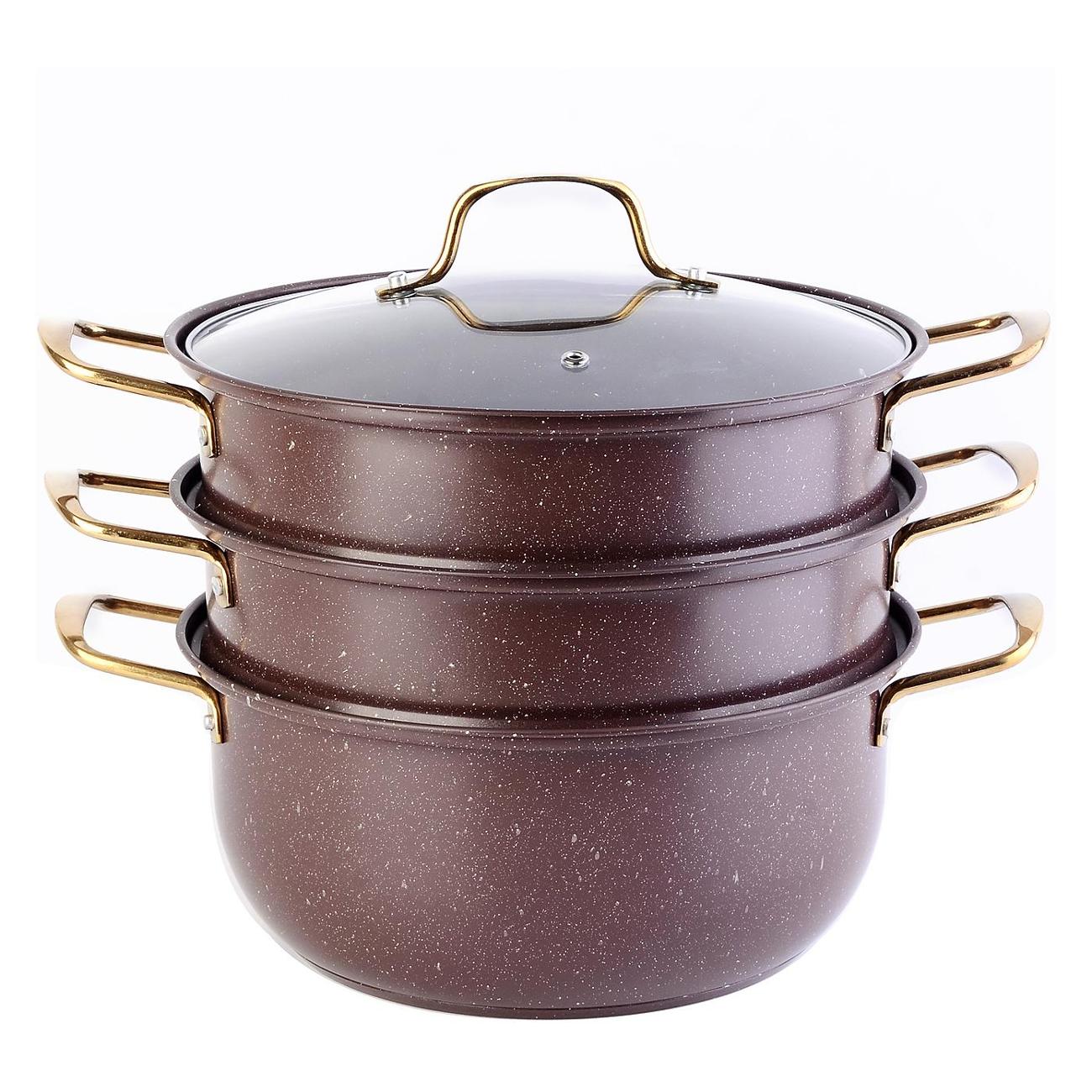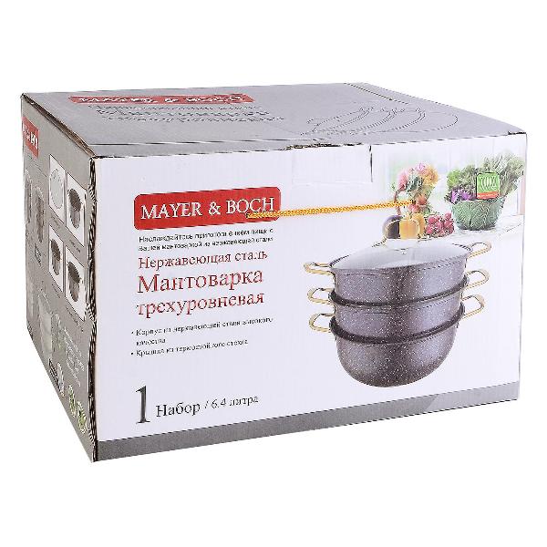 Мантоварка Mayer&Boch 31252 габаритами 32х30 см весит 2,08 кг. Посуда общим объемом 6,4 л подходит для всех вариантов плит и изготовлена из долговечной и износостойкой нержавеющей стали. Толстое индукционное дно предотвращает деформацию от перепада температуры и обеспечивает равномерный прогрев продуктов. На крышке из закаленного термостойкого стекла располагается отверстие для выхода пара. Рукояти не скользят в руках во время готовки. Эргономичная форма позволяет компактно хранить модель. Антипригарное покрытие легко очищается от загрязнений. Изделие можно мыть в посудомоечной машине.