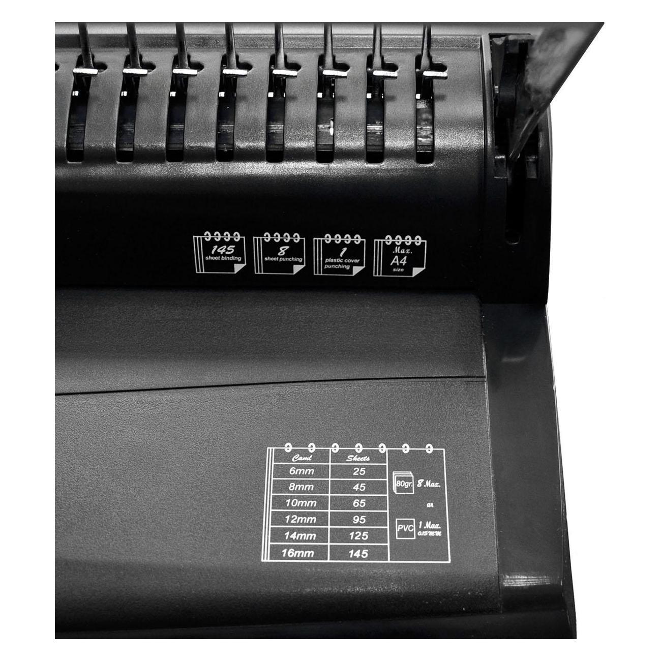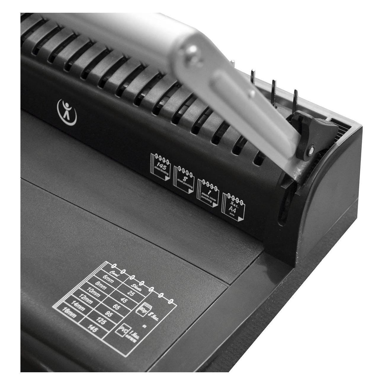 iBind A8 - переплетная машина на пластиковую пружину, отличающаяся простотой и удобством в эксплуатации. Компактные размеры и эргономичный дизайн делают машину удобной в работе, а на рабочем столе она занимает минимум места. iBind A8 представляет собой эффективное решение для переплета документов, идеально подходящее для дома и офисов. Механизмы перфорации, раскрытия/закрытия пружины сделаны из стали, рукоятка из алюминия, остальные детали корпуса выполнены из пластика - это обеспечивает легкость конструкции и упрощает транспортировку и хранение.Максимальная толщина переплета iBind A8 достигает 145 листов, что позволяет скреплять объемные отчеты и документы. Машина предназначена для работы с пластиковыми пружинами диаметром от 6,0 до 16 мм. Мощность ручного дырокола рассчитана на одновременную перфорацию до 8-и листов бумаги (зависит от плотности бумаги). Перфорация бумаги горизонтальная, удобная. Тип перфорации – ручной, пробивается 21 отверстие прямоугольной формы. На рабочем столе есть регулятор формата листа, позволяющий работать с документами формата А4 (21 отверстие, по длинной стороне) и А5 (15 отверстий по длинной стороне). Для удобства хранения и экономии пространства предусмотрена фиксация рукоятки перфорации в опущенном положении.iBind A8 – это надежный и удобный инструмент для создания аккуратных и профессиональных переплётов дома и в офисе, будь то отчёты, презентации или личные записи. Характеристки: Максимальная толщина переплета - 145 листов; Максимальный диаметр пружины - 16 мм; Мощность дырокола - 8 листов; Перфорация - горизонтальная; Тип перфорации - Ручной; Количество пробиваемых отверстий - 21; Регулятор формата листа: А4 - 21 отверстие, А5 - 15 отверстий; Рукоятка перфорации опускается вниз и фиксируется (для удобства хранения).