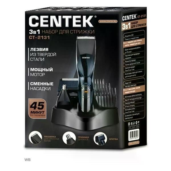 Есть множество факторов, которые покупателю следует учитывать при выборе машинки для стрижки. Качество и острота лезвий, направляющие гребни (насадки), возможность работы устройства от аккумулятора, мощность мотора, материал корпуса и многое другое. Являясь одним из лидеров по продажам бытовой техники и климатического оборудования на территории РФ и ближнего зарубежья, торговая марка CENTEK предлагает потребителю широкий выбор электрических машинок для стрижки. Вы сможете приобрести изделие, которое будет полностью соответствовать вашим запросам, будь то обычный триммер, машинка для стрижки или полноценный набор для стрижки. Набор для стрижки CT-2131 имеет следующие технические характеристики и комплектацию : Цвет - Черный;Мощность - 3 Вт;Аккумулятор - 2 \* 4/5AA400MAH, 2.4V;Работа от батареи - до 45 мин.;Полная зарядка - 8 часов;Индикатор зарядки;3 насадки (3,6,9 мм);Лезвия из твердой стали;Масло для смазки;Щетка для чистки;Подставка для подзарядки и хранения.