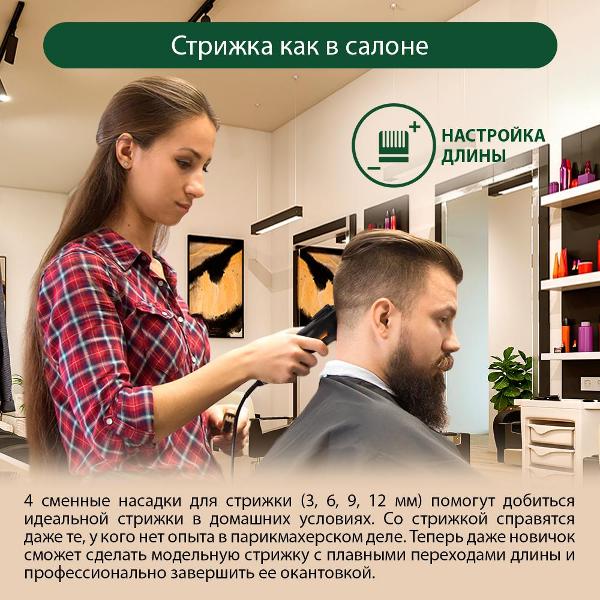 Устройство оснащено четырьмя сменными насадками, при помощи которых можно выбрать оптимальную длину стрижки волос (от 3 мм до 12 мм). Лезвия выполнены из керамики и остаются острыми даже при частом использовании. Благодаря титановому покрытию на голове не появляются раздражения. В комплект входят масло для смазки и щеточка.