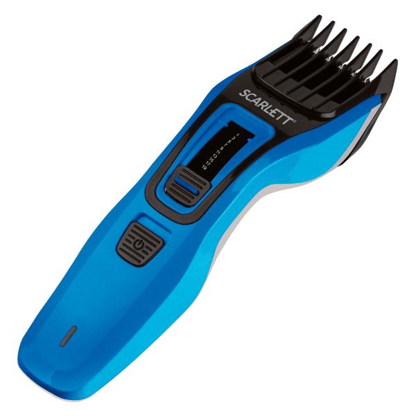 Машинка для стрижки волос Scarlett SC-HC63C60 в корпусе сине-черной расцветки может работать от стандартной электросети или от встроенной батареи емкостью 600 мА*ч. Мощность прибора составляет 5 Вт. Время непрерывной работы от аккумулятора — около 50 минут.