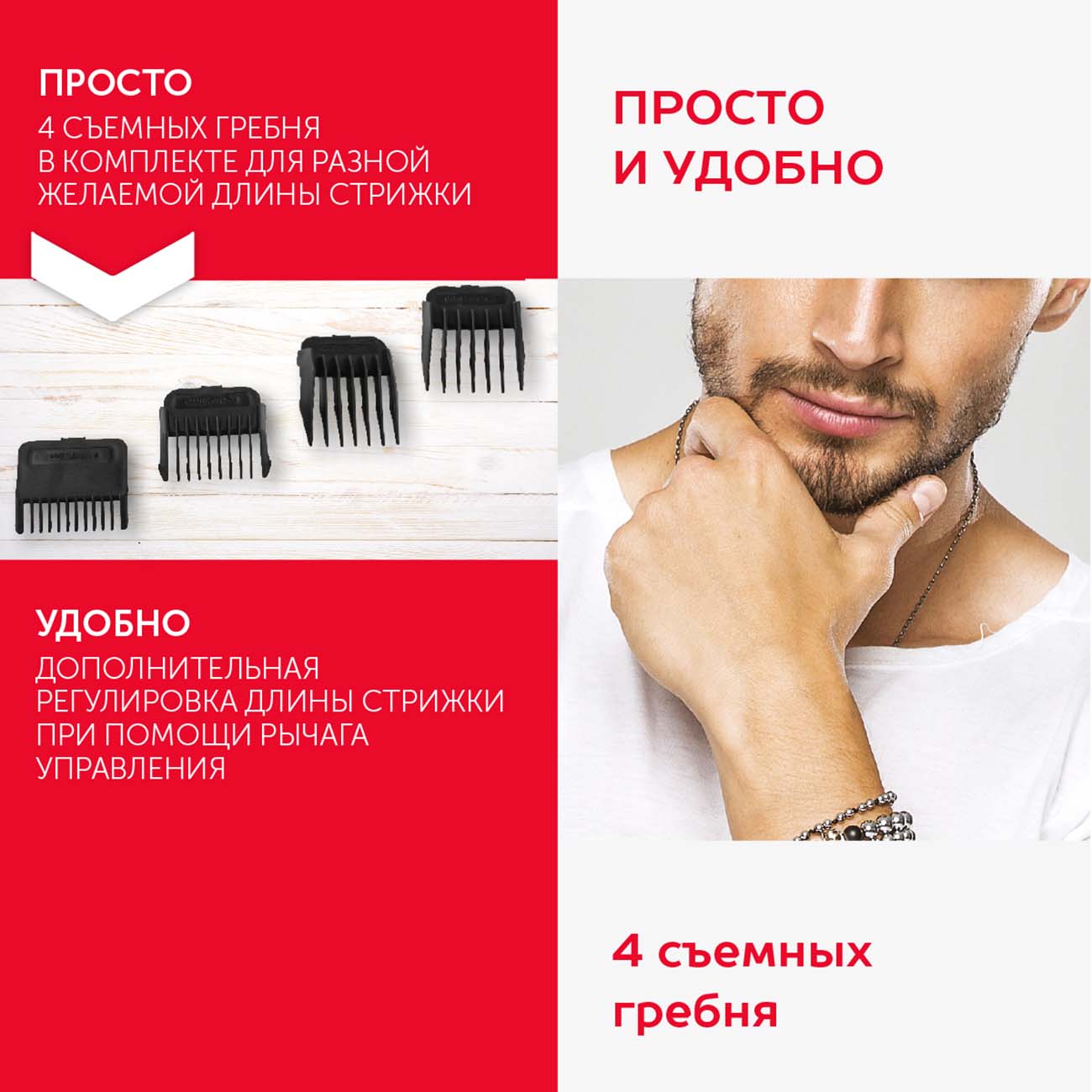 В комплект входят четыре съёмных насадки, позволяющие изменять длину срезаемых прядей. Для более тонкой настройки предусмотрен удобно расположенный рычаг.