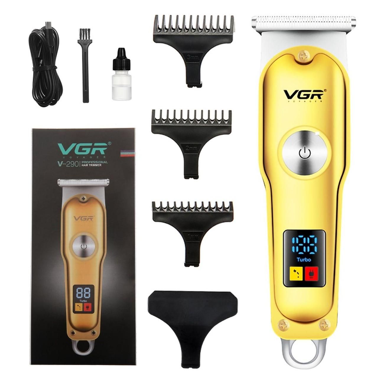 Машинка для стрижки волос VGR V-290 в корпусе золотисто-серебристой расцветки оснащена светодиодным дисплеем, индикацией включения и заряда аккумулятора. Модель предназначена для эксплуатации в домашних условиях. В комплекте поставляются четыре насадки, которые позволяют варьировать длину стрижки в диапазоне от 1 мм до 3 мм.