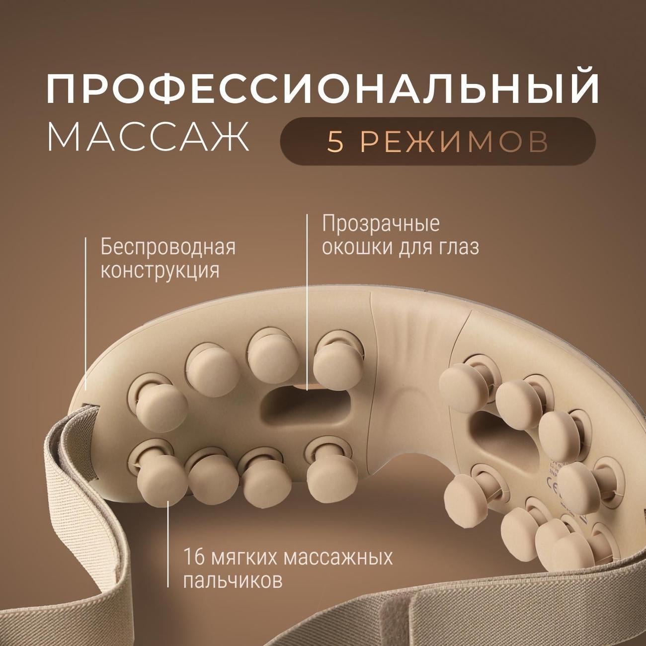 Устройство предлагает пять режимов работы: для расслабления, для косметической коррекции, для облегчения засыпания, комплексного воздействия и отдельного прогрева. Массажные программы позволяют выбрать подходящий тип воздействия в зависимости от задачи. Для акустического сопровождения предусмотрены релаксирующие мелодии, а модуль Bluetooth обеспечивает подключение к смартфону. Система прозрачных окон делает возможным выполнение бытовых задач без снятия изделия.