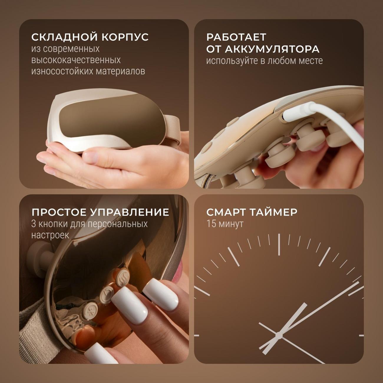 При систематическом применении устройство способствует уменьшению отеков и кругов под глазами, сокращает выраженность морщин, связанных с мышечным напряжением. Массаж улучшает циркуляцию и оксигенацию тканей, что помогает восстанавливать комфорт в области глаз, уменьшать сухость и раздражение. Автоматическое отключение через 15 минут делает процедуру контролируемой и удобной.