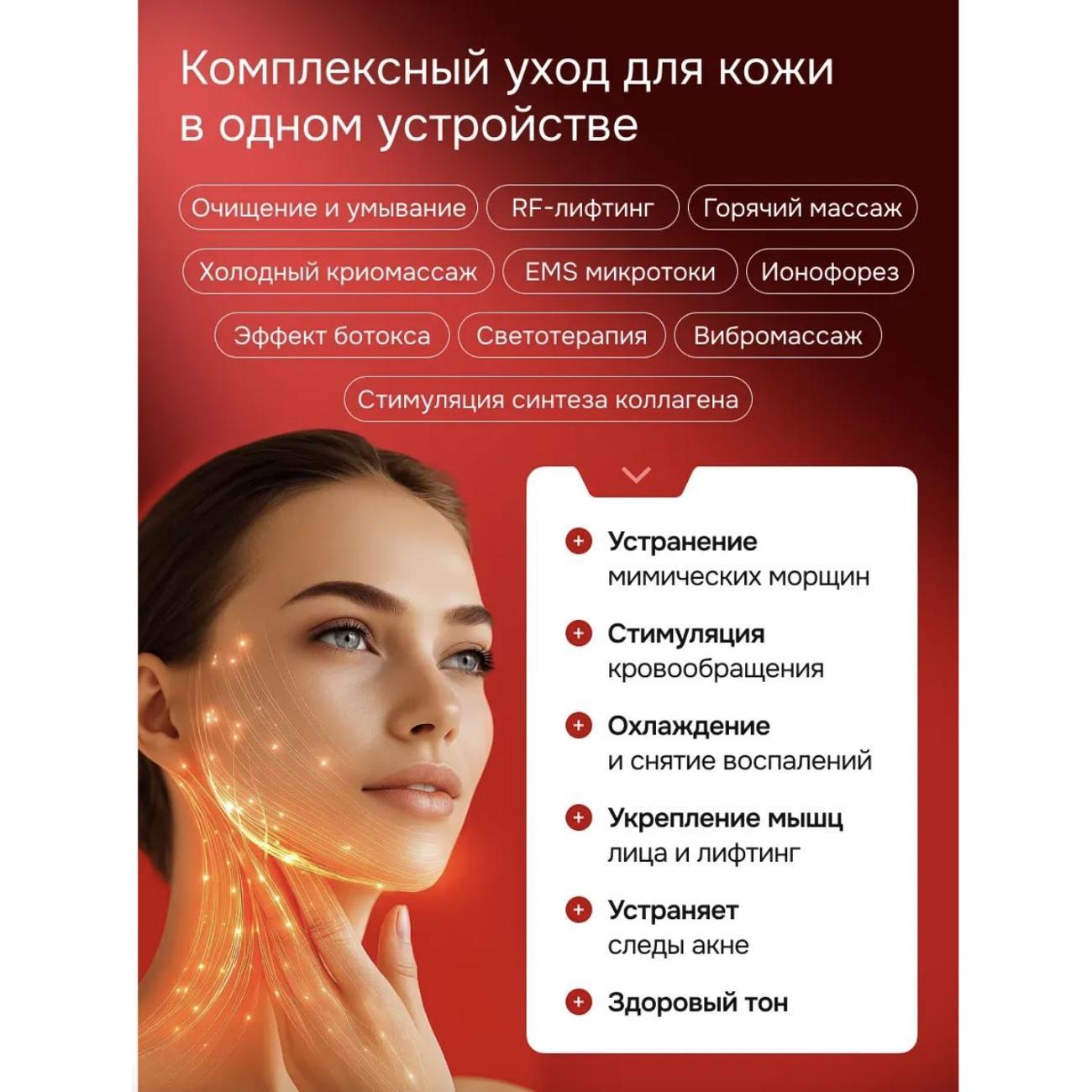 Откройте секрет ухоженной кожи с нашим косметическим микротоковым аппаратом! Микротоковый массажер для лица и шеи - инновационное устройство сочетает в себе функции RF-лифтинга, EMS-микротоков и LED-терапии, что делает его идеальным помощником для ухода за кожей лица, шеи, декольте и зоны вокруг глаз. С помощью горячего и холодного криомассажа вы многократно усилите эффективность и действие вашей уходовой косметики. Массажер для лица микротоковый помогает в борьбе с воспалениями и темными кругами. Благодаря вибромассажу и стимуляции кровообращения, вы сможете укрепить мышцы лица, скорректировать овал, добиться здорового тона. Направляя микротоки аппарат для лица снятию отеков и зажимов, обеспечивая расслабление и комфорт после долгого дня. С 10 режимами работы, наш электромассажер легко адаптируется под ваши индивидуальные потребности, а удобный дизайн и интуитивно понятный дисплей делают его использование простым и приятным. Работая от аккумулятора, он обеспечивает до 60 минут автономной работы, позволяя наслаждаться процедурами в любом месте! Закажите себе и своим близким массажный аппарат для комплексного ухода за кожей, он станет отличным подарком на Новый год для тех, кто ценит красоту и здоровье!