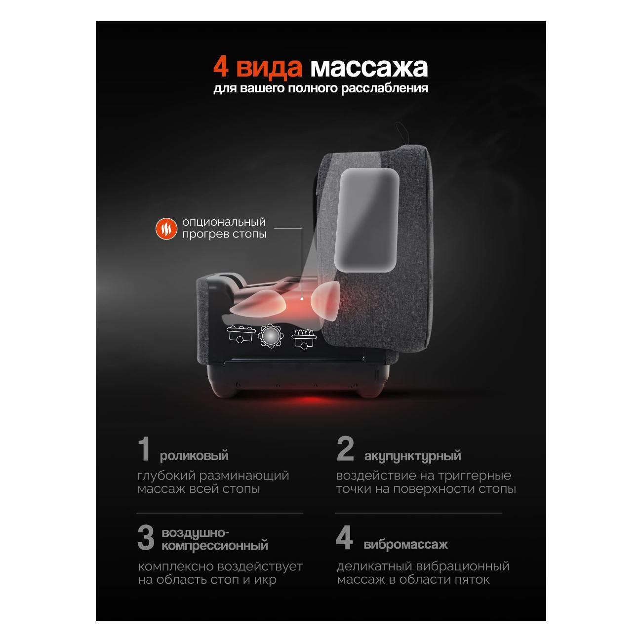 настройка: выбор зон массажа (стопы, икры), регулировка интенсивности;