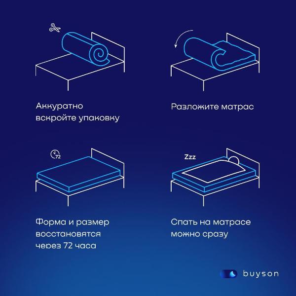 Разносторонний матрас позволит вам сэкономить время и деньги на поиске идеального варианта. Вы можете легко регулировать степень комфорта, просто перевернув матрас. Сторона с этикеткой buyson - средняя жесткость на основе пены AirFoam (ЭйрФоам). Сторона без этикетки и со смотровой молнией – жесткость выше средней (с кокосом).