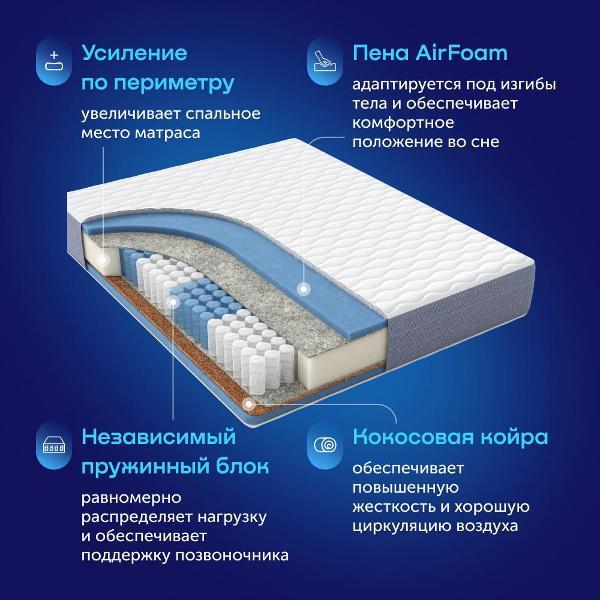 Для вашего удобства матрас поставляется в скрученном виде, в вакуумном рулоне и гарантирует идеальное раскрытие после распаковки. Дышащая анатомическая пена с открытой пористой структурой AirFoam (ЭйрФоам) перераспределяет точечную нагрузку, улучшая микроциркуляцию