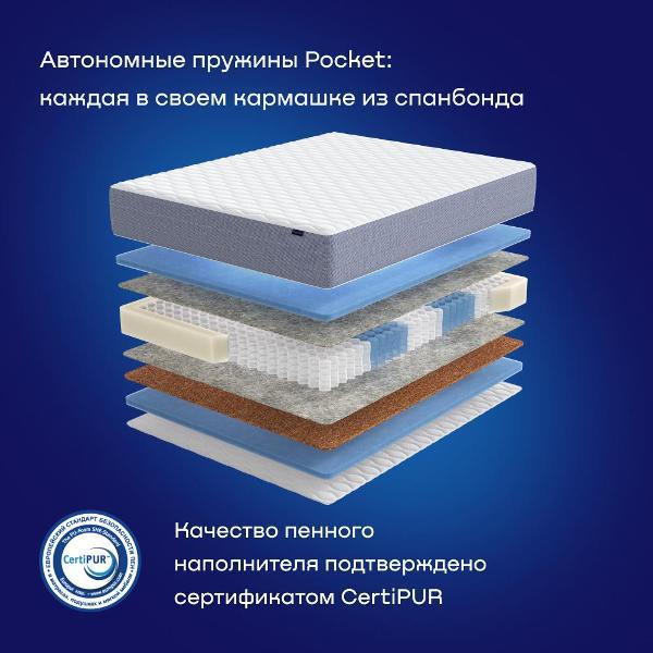 Пружинный блок Pocket выдерживает высокие нагрузки и обеспечивает правильную поддержку всего тела. Кокосовая койра отвечает за повышенную жесткость и создает более комфортный микроклимат, обеспечивая хорошую циркуляцию воздуха. Это натуральное природное волокно отличается прочностью и эластичностью, хорошо пропускает воздух и устойчиво к влаге.