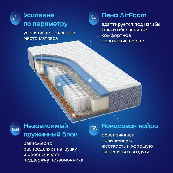 Для вашего удобства матрас поставляется в скрученном виде, в вакуумном рулоне и гарантирует идеальное раскрытие после распаковки. Дышащая анатомическая пена с открытой пористой структурой AirFoam (ЭйрФоам) перераспределяет точечную нагрузку, улучшая микроциркуляцию