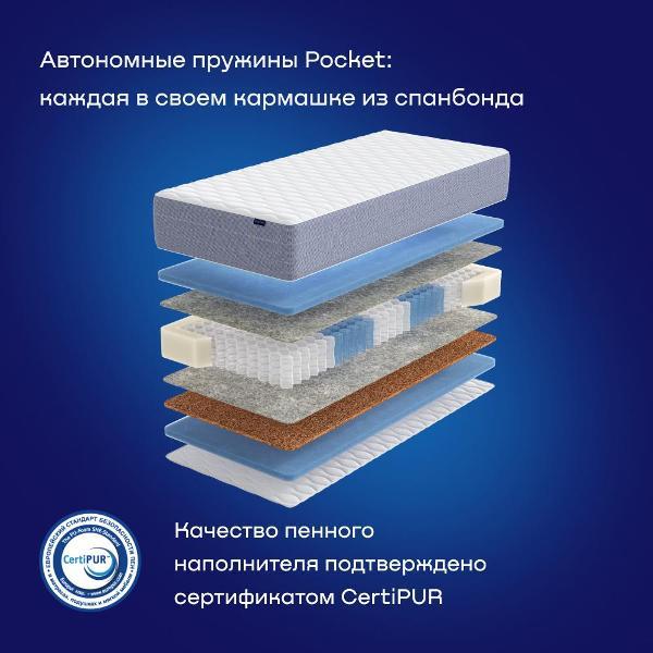 Пружинный блок Pocket выдерживает высокие нагрузки и обеспечивает правильную поддержку всего тела. Кокосовая койра отвечает за повышенную жесткость и создает более комфортный микроклимат, обеспечивая хорошую циркуляцию воздуха. Это натуральное природное волокно отличается прочностью и эластичностью, хорошо пропускает воздух и устойчиво к влаге.