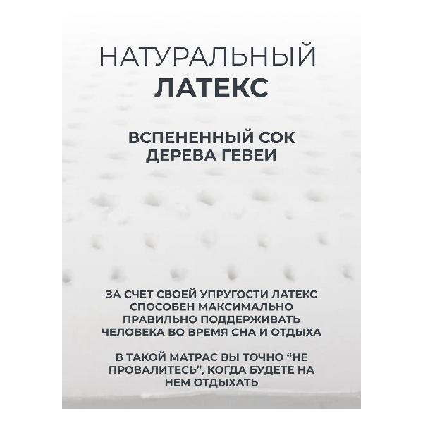 В основе матраса лежит блок современного пенополиуретана толщиной 14 сантиметров. С этой стороны изделие имеет среднюю жесткость. С другой стороны проложено два слоя — рельефный пенополиуретан, который служит для точечного воздействия на тело человека и слой натурального латекса, который и дает матрасу умеренно-мягкий эффект спальной поверхности. Латекс упруг, но в то же время и эластичен — он способен подстраиваться под рельеф спящего человека, делая отдых на такой поверхности максимально расслабляющим.