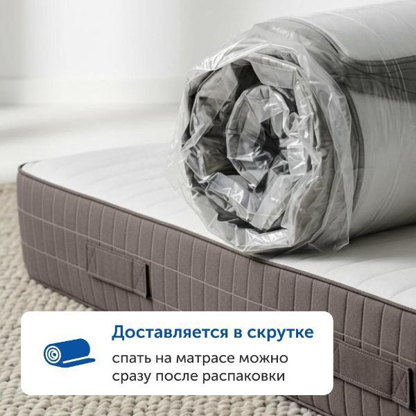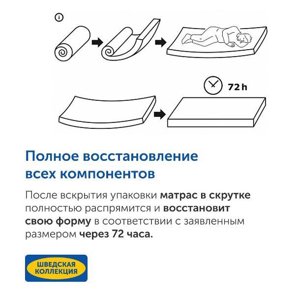 Доставляется в компактном скрученном виде (в рулоне). После вскрытия упаковки матрац в скрутке полностью распрямится и восстановит свою форму в соответствии с заявленным размером через 72 часа.