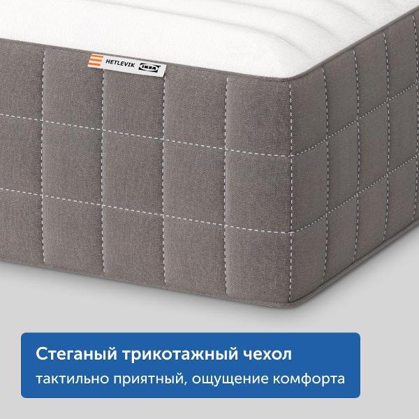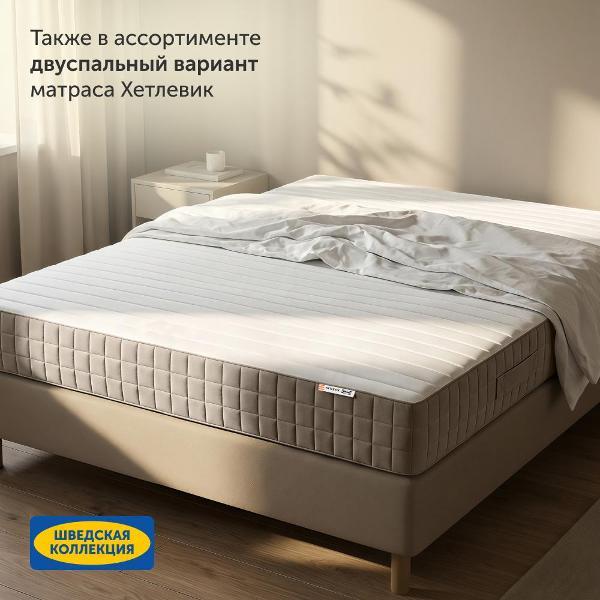 Хетлевик — довольно жесткий матрас из ассортимента IKEA, с независимыми пружинами. Оптимально высокий (19 см). Равномерно распределяет нагрузку и обеспечивает точечную поддержку позвоночника (ортопедический эффект).