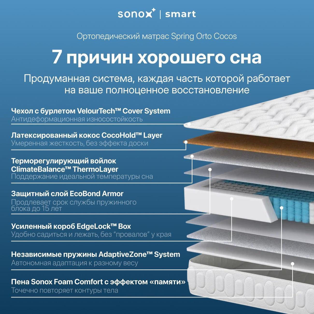 Вы можете купить Матрас SONOX Sleep Tech COCOS, 160х200 в магазинах М.Видео по доступной цене. Матрас SONOX Sleep Tech COCOS, 160х200: подробное описание, фото и отзывы реальных покупателей, характеристики, возможность скачать инструкции и подобрать аксессуары.