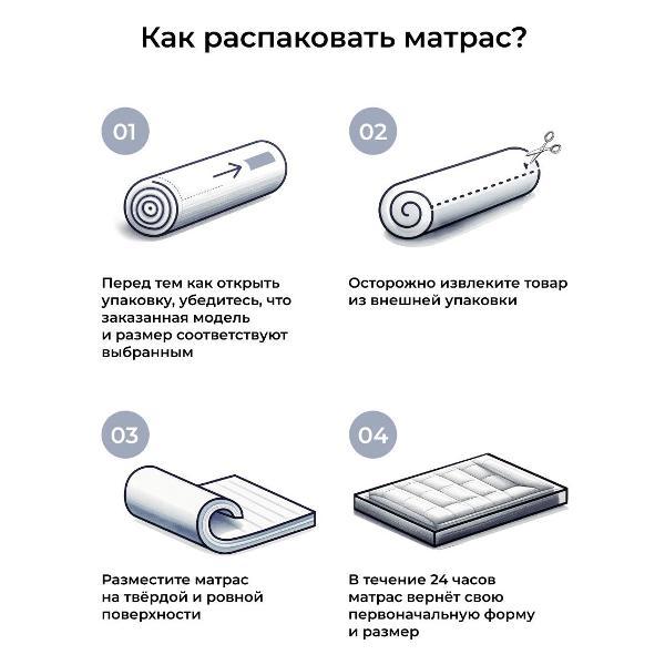 При правильных условиях хранения матрас может находиться в скрученном виде в течение 1 месяца, начиная с даты производства, в зависимости от наполнения.