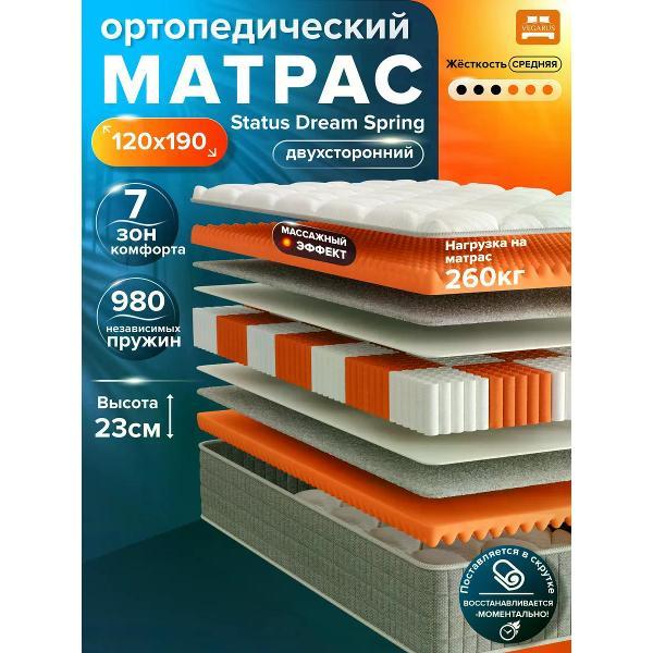 Матрас на кровать в рулоне Status Dream spring с 7 зональным пружинным блоком независимых пружин, 980 штук на одно спальное место. Матрац спальный имеет двустороннее основание средней жёсткости. Матрас с массажным эффектом ячеистой угольной пены Air Foam. Матрас ортопедический имеет 1,5 спальный размер. Лёгкая и упругая ультрасовременная пена подарит комфортное состояние отдыха, способствует улучшению сна, снимет утомляемость и напряжение. Матрасы для кровати или как самостоятельное место для сна на полу. Независимые пружины двойного каления по технологии «Живые пружины», быстро восстанавливают свою форму. В матрасе присутствует гипоаллергенный синтепон, спанбонд и несъемный чехол. Для долгой службы матраца в изготовлении чехла (верхнего слоя) используется трикотаж высокого качества. Матрас анатомический прослужит долго при постоянных высоких нагрузках, так как имеет повышенную устойчивость к износу. Все материалы антистресс, гипоаллергенны, что даёт возможность применять не только для взрослых, но и для детей и людей с чувствительным организмом. Отличное решение в спальню и в детскую комнату, для дома и дачи. Матрас полуторка 120х190.