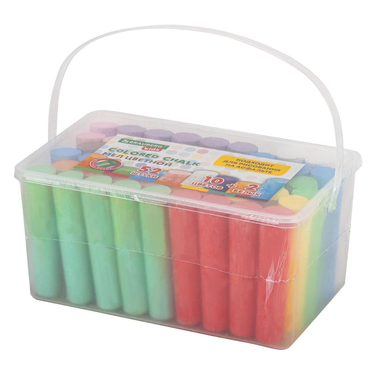 Невероятно большой набор из 52 мелков! В набор входят два белых мелка, а также по пять мелков десяти разных цветов: красный, желтый, зеленый, светло-зеленый, оранжевый, голубой, светло-голубой, коричневый, розовый, фиолетовый. Благодаря круглой утолщенной форме мел удобно ложится в руку. Изготовлен из высококачественного природного сырья, нетоксичен. Легко смывается с рук. Мел упакован в пластиковый контейнер – идеально, чтобы хранить мел или брать его с собой.