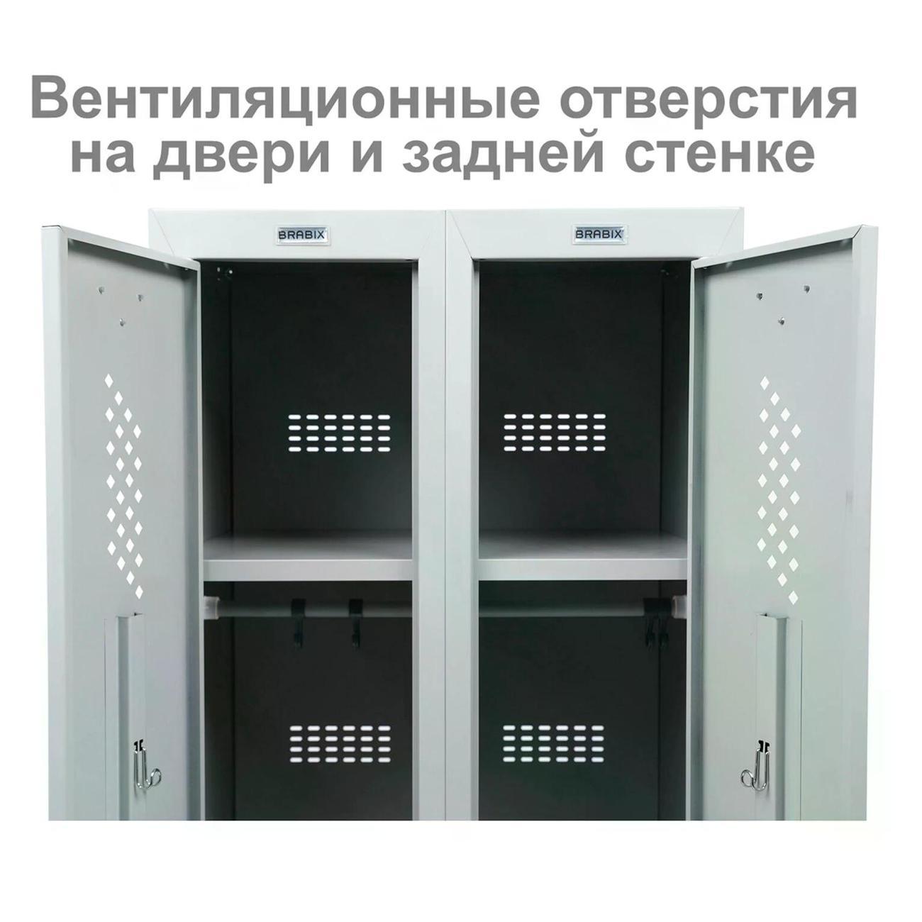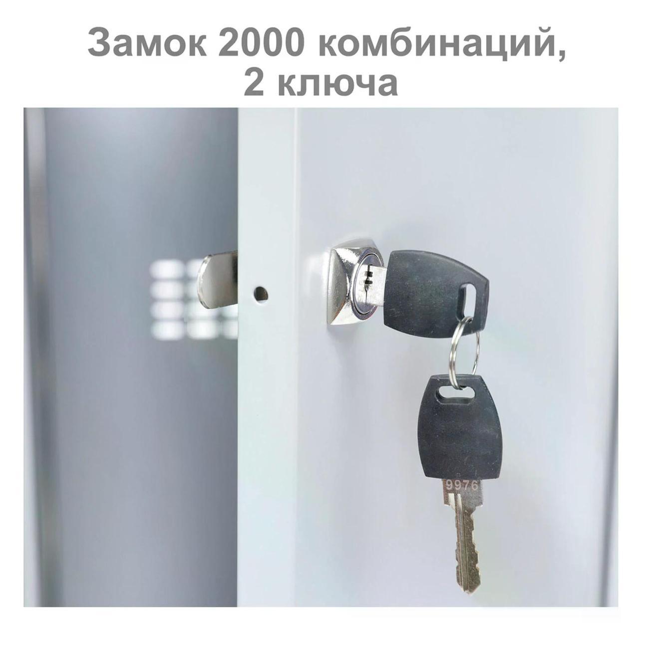 Шкаф имеет 2 раздельные секции и предназначен для двух пользователей. На дверях установлены ключевые замки с возможностью выбора из 2000 комбинаций. В комплект входят по 2 ключа на каждую дверь.