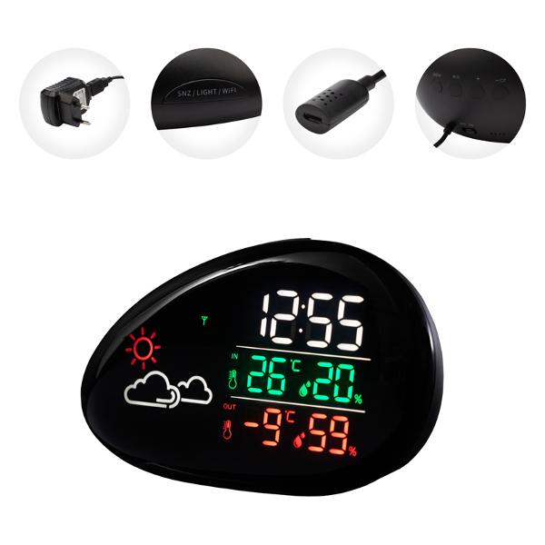 Прибор можно использовать самостоятельно или вместе с другими устройствами в системе «Умный дом». Размер модели — 9,6х15,25х5,9 см. Вес изделия — 250 г. На цветном LED-дисплее отображаются температура, влажность внутри и снаружи помещения, а также прогноз погоды. Устройство можно использовать в качестве будильника.