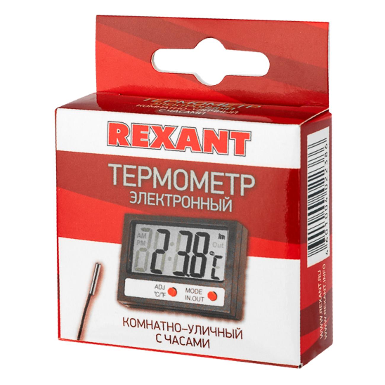 Метеостанция Rexant 70-0505 черного цвета измеряет температуру, влажность внутри и снаружи помещения благодаря выносному датчику с проводом длиной 1 м. Присутствует функция часов и будильника. Время отображается в двух форматах: 12 ч и 24 ч. Корпус сделан из прочного пластика ABS.