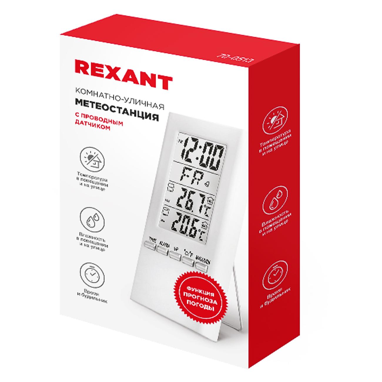 Метеостанция Rexant S3331SC оснащена проводным датчиком для измерения влажности в помещении от 20% до 90%, температуры внутри от 0°C до 50°C и снаружи от -40°C до 70°C. Показатели отображаются на встроенном монохромном дисплее. Прибор также транслирует время, дату, прогноз погоды и позволяет запустить будильник со звуковым сопровождением.