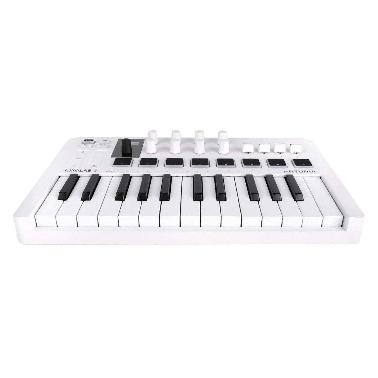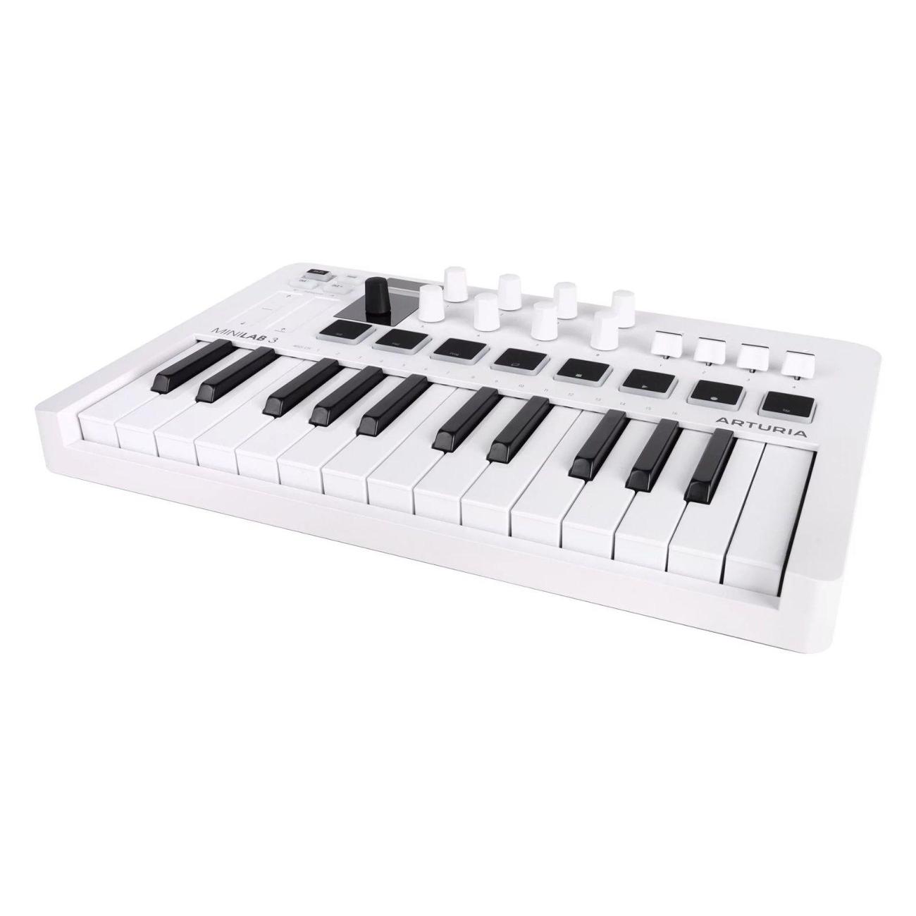 Midi клавиатура Arturia MiniLab 3 White — компактный и универсальный контроллер, который предоставляет музыкантам и продюсерам интуитивно понятные инструменты для создания музыки, управления виртуальными инструментами и интеграции с цифровой звуковой рабочей станцией (DAW).