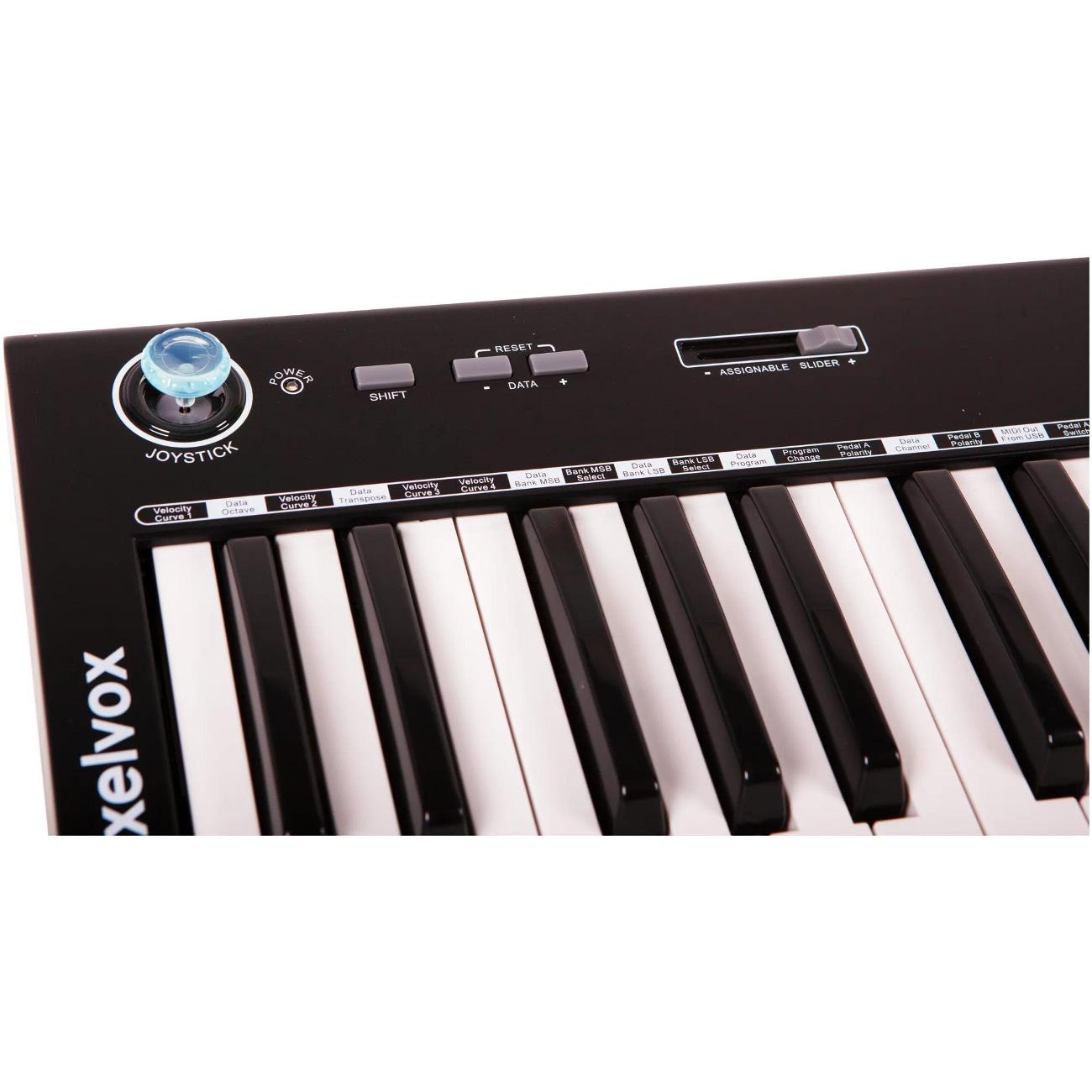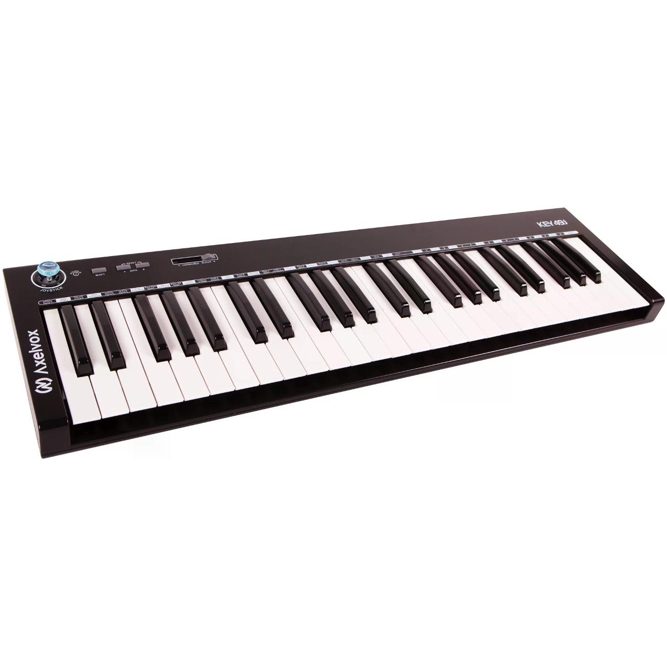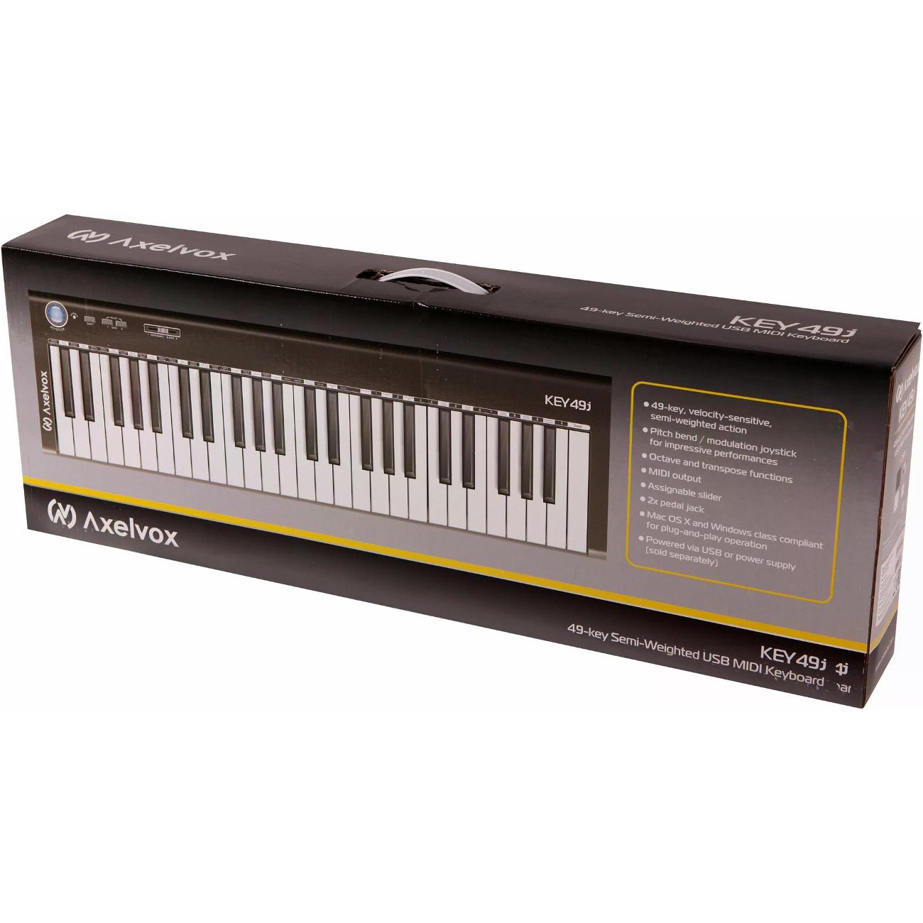 Midi-клавиатура Axelvox KEY49j черного цвета управляется слайдером и джойстиком. Доступна функция транспонирования, изменение высоты тона, октавный сдвиг. 49 полноразмерных клавиш чувствительны к силе нажатия, что позволяет воспроизводить все оттенки звука. Кнопками на передней панели можно регулировать громкость, переключать октавы. Для подключения внешних носителей, ноутбука или компьютера предусмотрен порт USB 2.0, инструментов — интерфейс MIDI. Можно подсоединять педали через специальные разъемы. Вес — 3 кг, размер — 21х6х72 см.