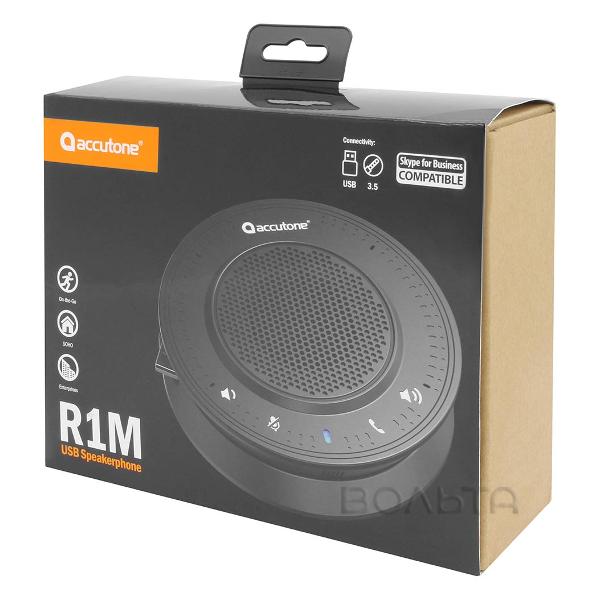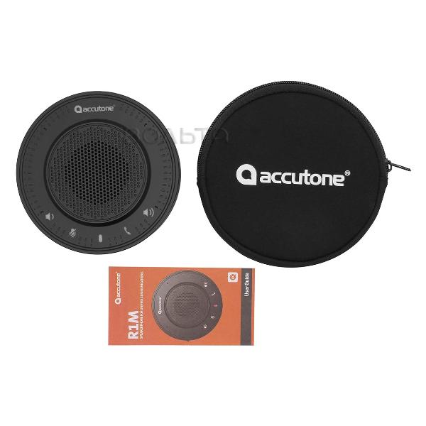 Микрофон для компьютера со встроенным динамиком Accutone ZA-R1M весом 260 г изготовлен из пластика черного цвета. Габаритные размеры: высота 3,7 см, диаметр 13 см. Корпус оснащен индикацией включения с сенсорными кнопками и USB-штекером, благодаря которому происходит подключение к ПК. Прибор совместим с операционными системами macOS, Windows, Linux. Микрофон конденсаторный всенаправленный. Дальность действия в помещениях не превышает 2 м.