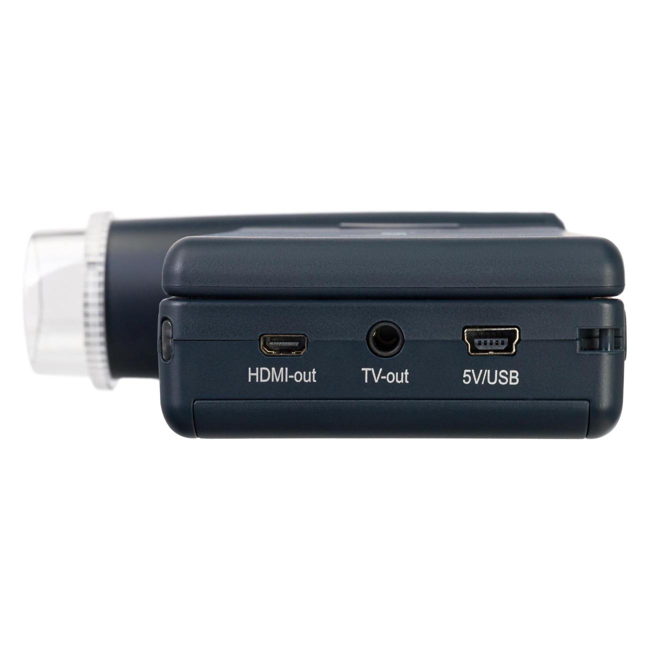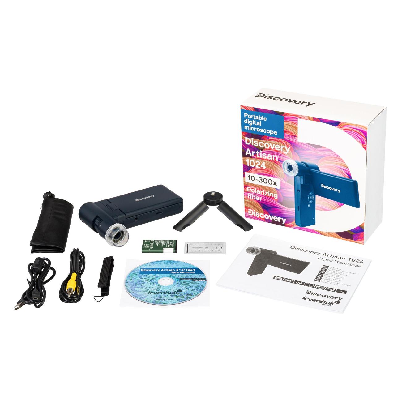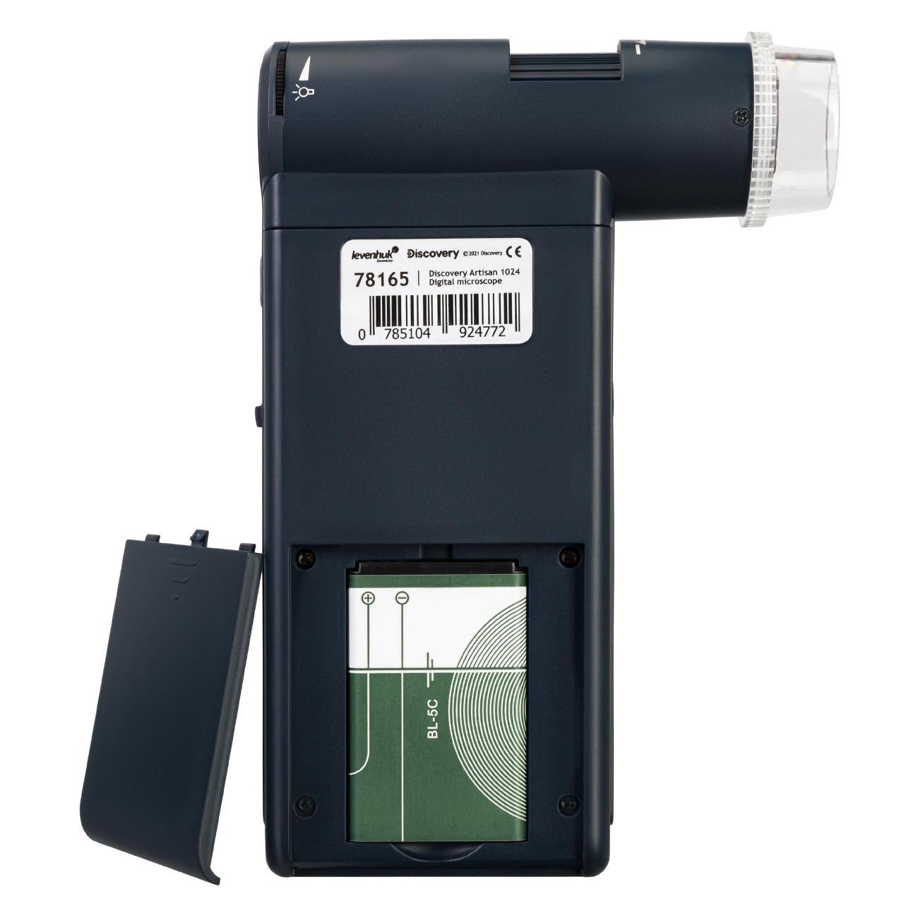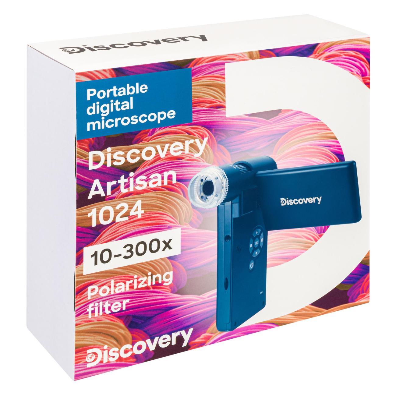 Микроскоп Discovery Artisan 1024 для начинающих заключен в черный пластиковый корпус. Модель питается от Li-Ion-аккумулятора, от USB-порта и от сети. Устройство оснащено поворотным цветным ЖК-экраном диагональю 4" и светодиодной подсветкой, яркость которой можно регулировать. При разрешении матрицы 12 Мп увеличение составляет 10–300 крат. Вес конструкции составляет 485 г.
