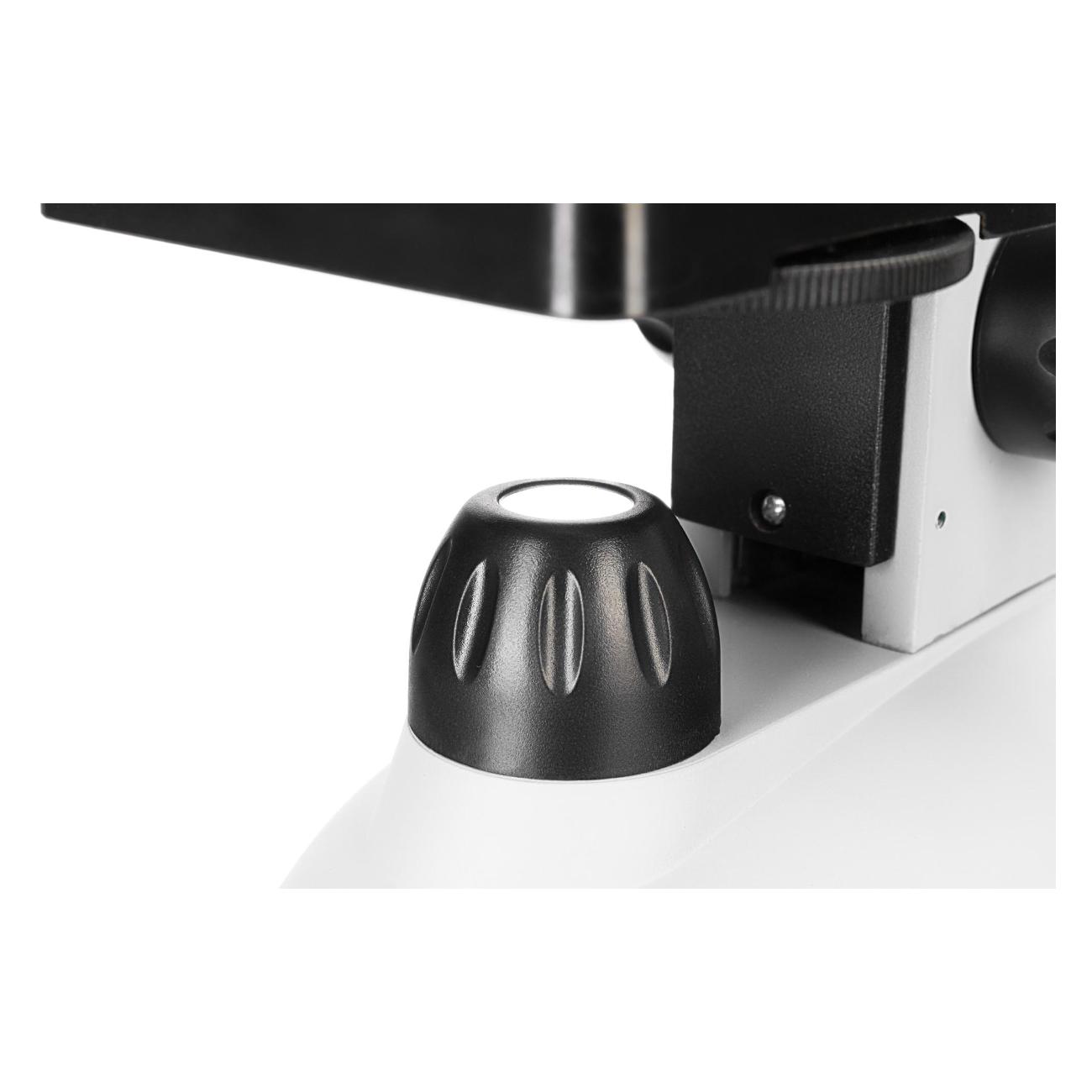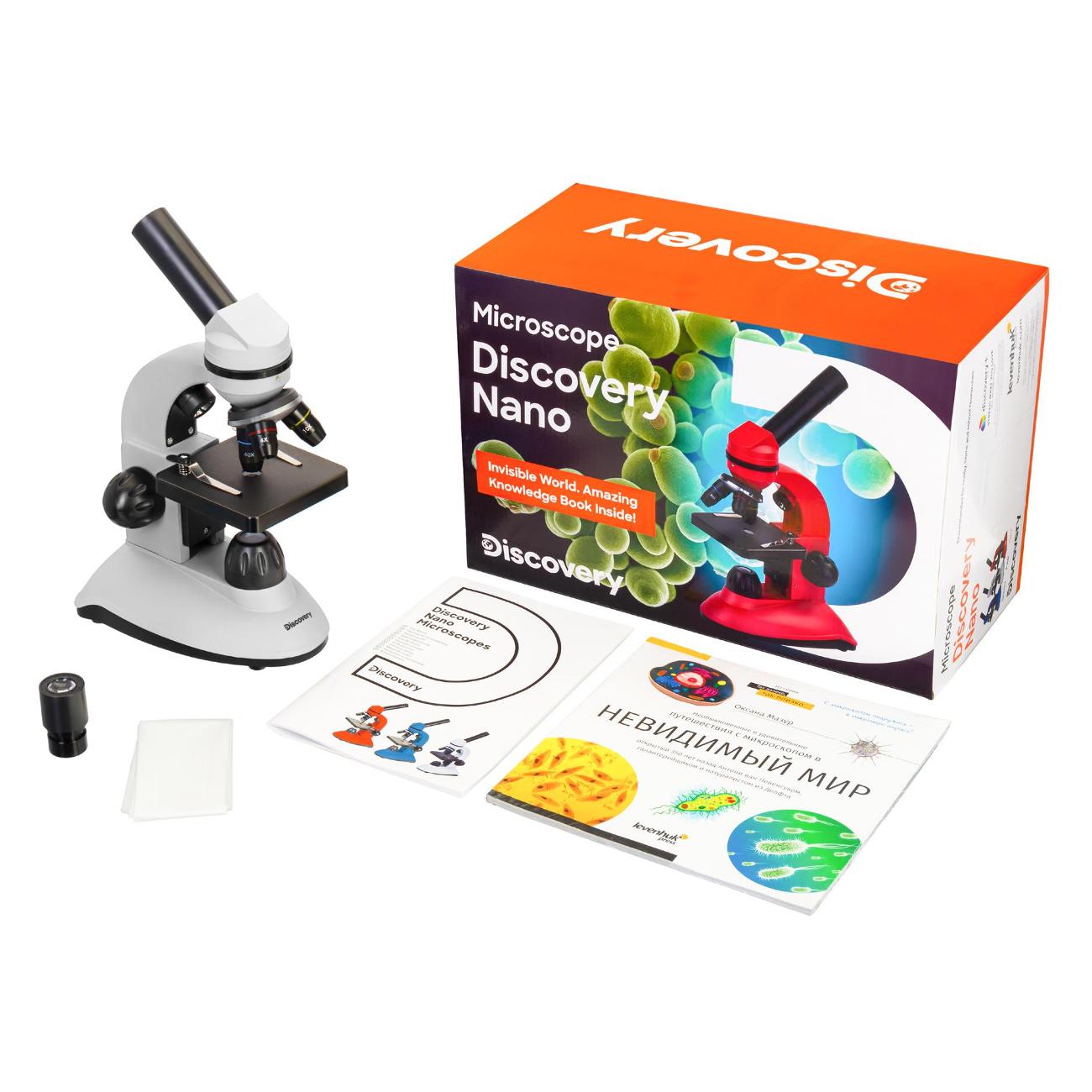 Монокулярный микроскоп Discovery Nano обеспечивает увеличение в диапазоне 40–400 крат. Устройство получило белый пластиковый корпус с металлическими элементами, дополненный предметным столиком 90х90 мм, светодиодной подсветкой и револьверным устройством на три объектива. Модель использует оптическое стекло WF10x и диск с диафрагмами. За питание отвечает три батареи ААА-типа.