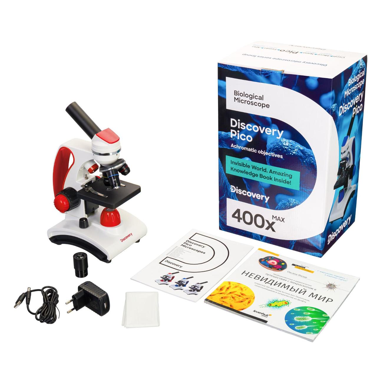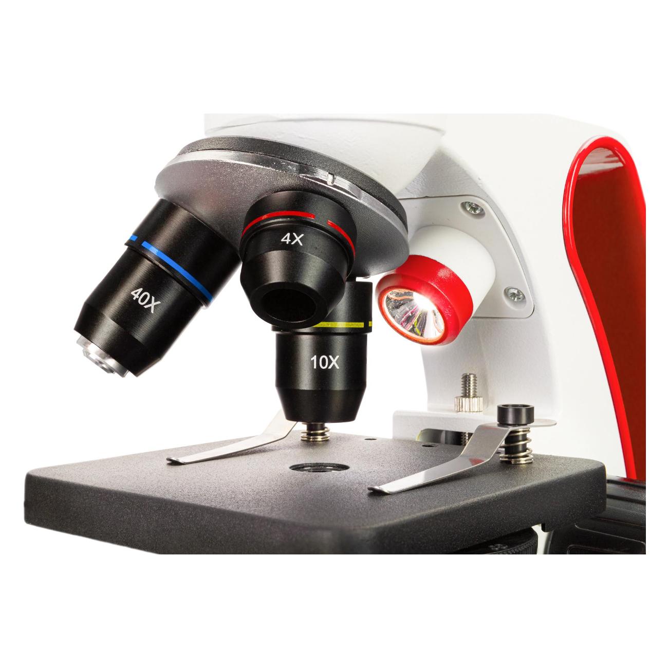 Монокулярный микроскоп Discovery Nano Pico Terra 77974 обеспечивает увеличение в диапазоне 40–400 крат. Устройство получило бело-красный пластиковый корпус с металлическими элементами, дополненный предметным столиком 90х90 мм, светодиодной подсветкой и револьверным устройством на три объектива. Модель использует оптическое стекло WF10x и диск с диафрагмами. За питание отвечает три батареи ААА-типа.