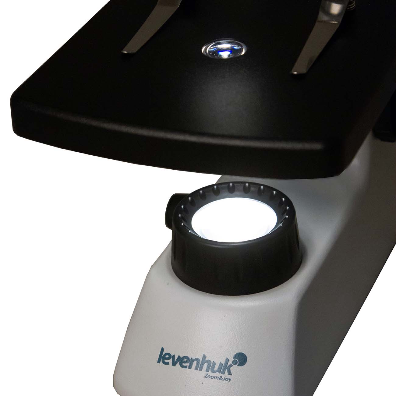 Микроскоп снабжён системами грубой и точной фокусировки. Для этого есть две ручки. Если вам понадобится исследовать окрашенные образцы, можно воспользоваться подсветкой. В качестве источника используется галогенная лампа с коллектором. Вы сможете регулировать её яркость по мере необходимости.