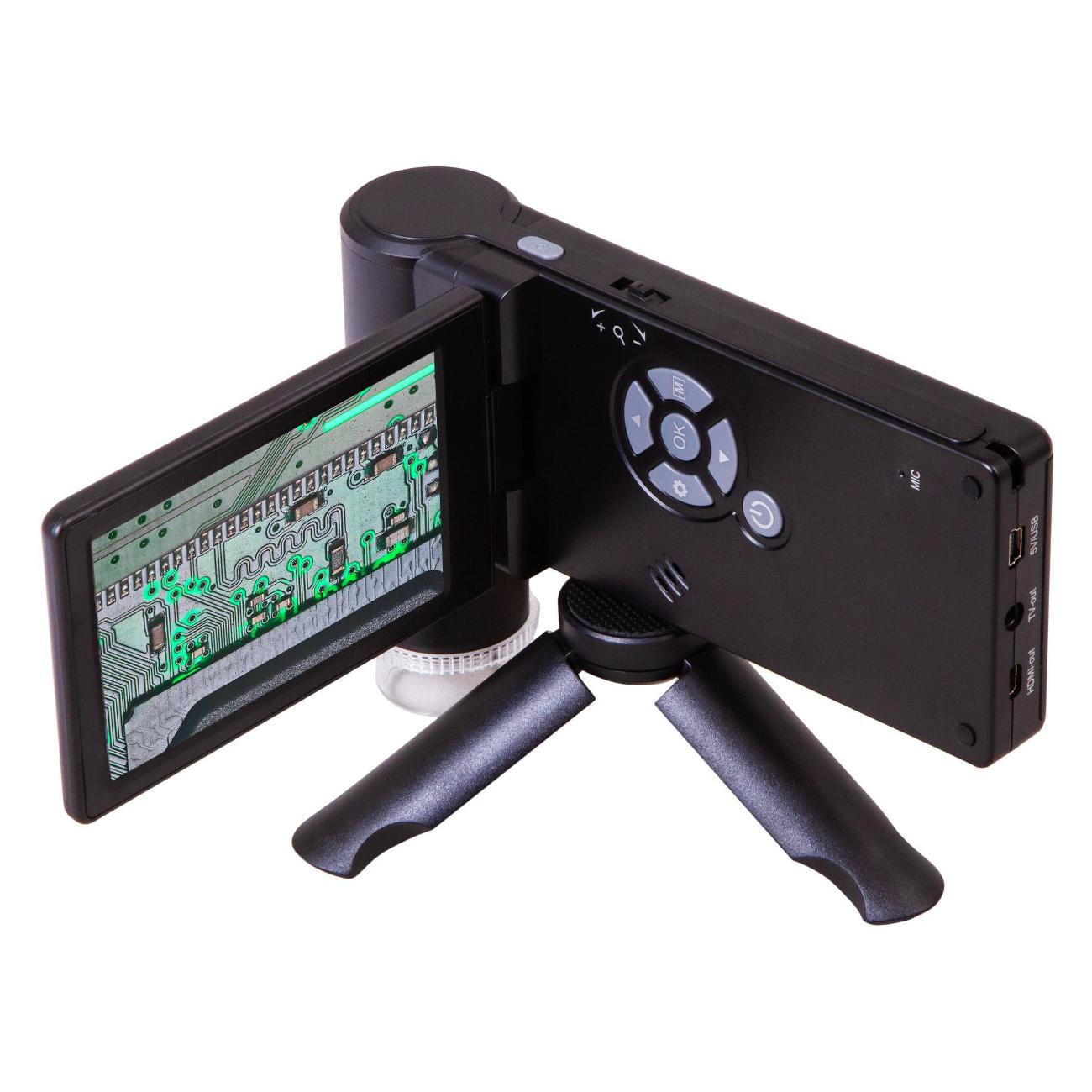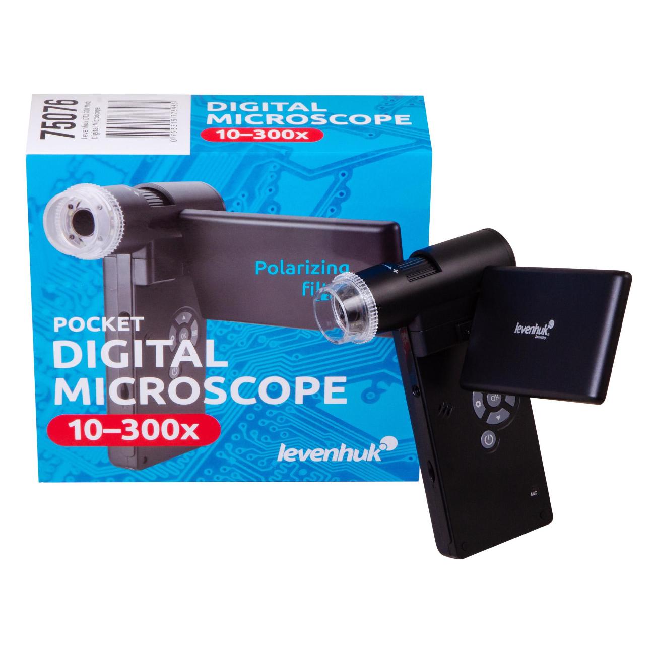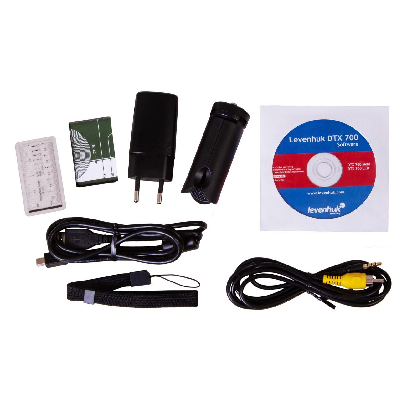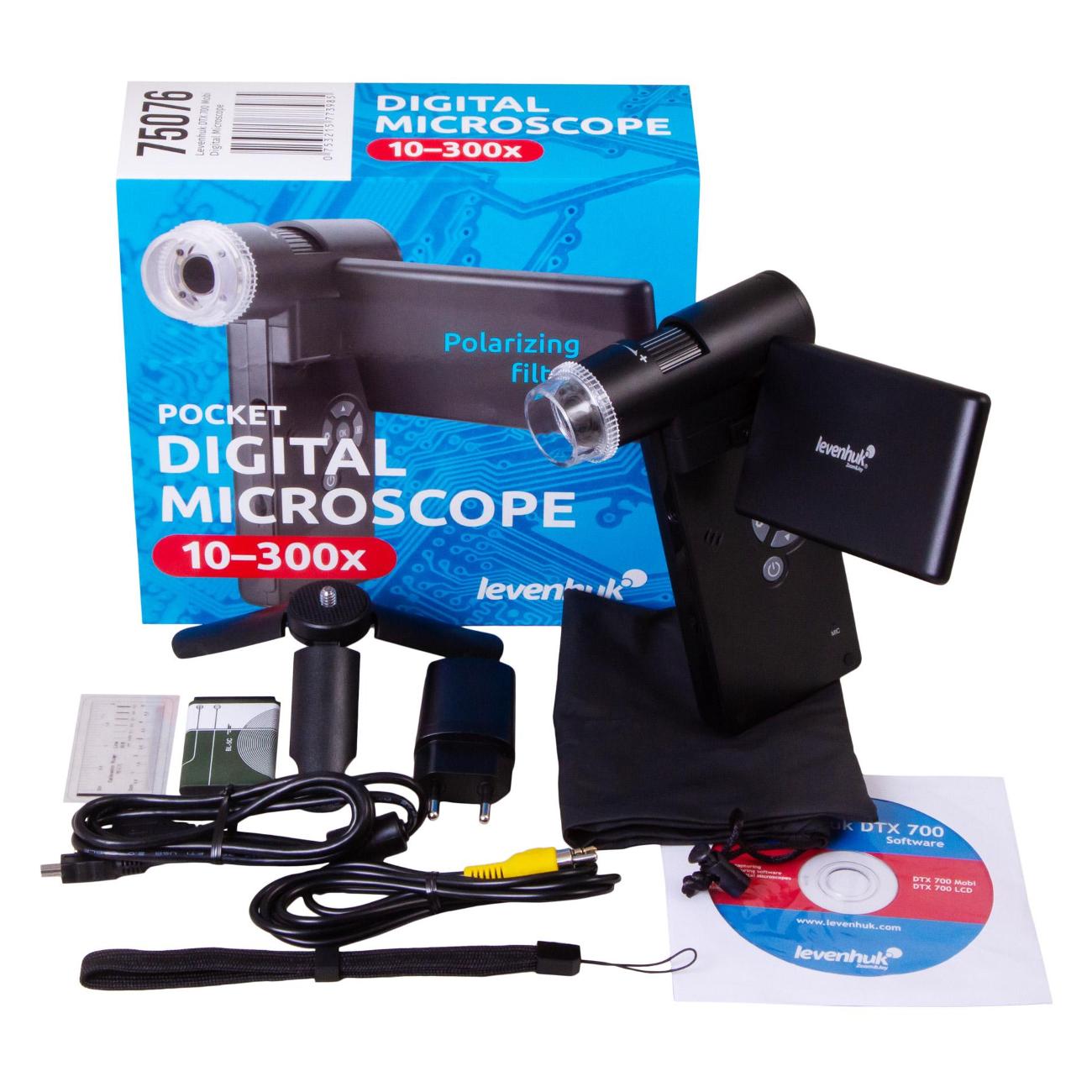 Микроскоп Levenhuk DTX 700 Mobi в пластиковом черном корпусе питается от сети, оснащается Li-Ion-батареей и поддерживает работу от USB-порта. Устройство получило светодиодную подсветку и поворотный цифровой дисплей диагональю 4". Прибор справляется с увеличением 10–300 крат. Вес аппарата не превышает 600 г.