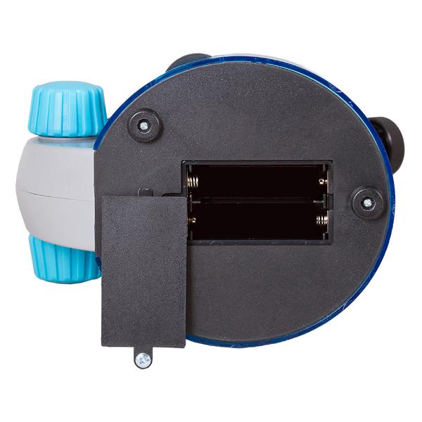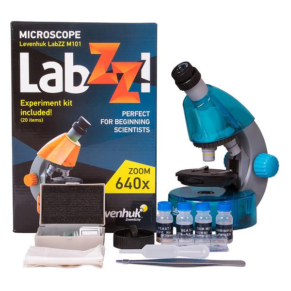 Микроскоп Levenhuk LabZZ M101 Azure (69301) использует светодиоды в качестве подсветки. Диаметр подвижного предметного столика составляет 8,2 см при габаритах всей конструкции 13х18,5х27 см и весе 930 г. Пластиковый корпус выполнен в голубом цвете и дополнен оптическим стеклом с увеличением 40-640 крат. Питание осуществляется от двух АА-батарей. В комплектацию входят металлические зажимы и набор для совершения опытов.