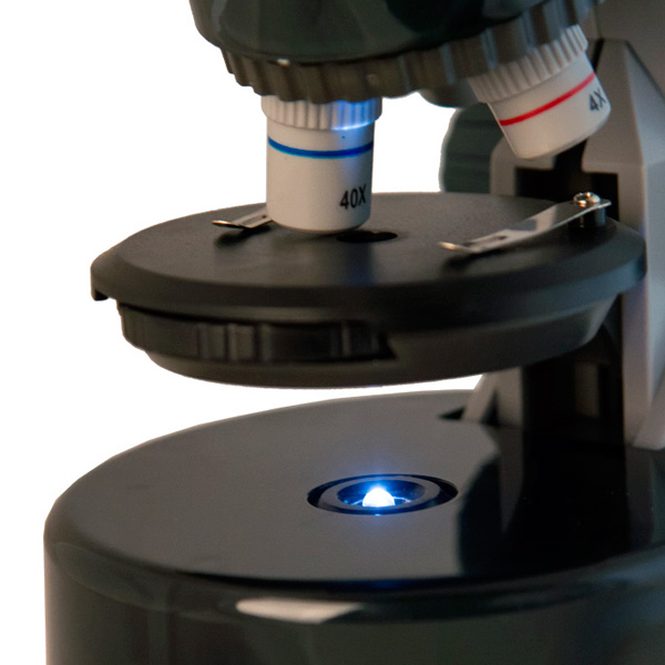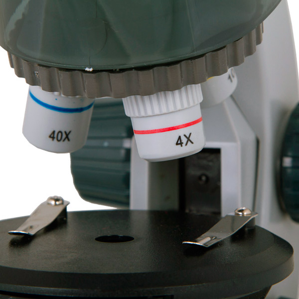 Прибор снабжён револьверным механизмом с тремя объективами на 4, 10 и 40 крат. Вместе с двухпозиционном окуляром (х10 и х16) это позволяет получать максимальное увеличение в 640 раз! При таком приближении можно будет даже изучать срезы тканей и крупные органеллы клеток.