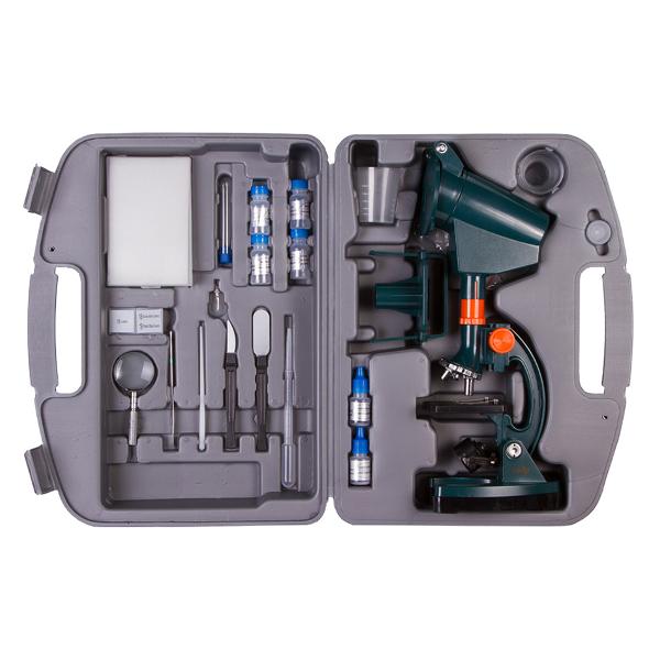 Микроскоп Levenhuk LabZZ M3 (69741) использует зеркало в качестве подсветки. Размеры неподвижного предметного столика составляют 6х6,5 см при габаритах всей конструкции 10х59х38 см и весе 380 г. Пластиковый корпус выполнен в черно-синих тонах и дополнен оптическим стеклом с увеличением 300-1200 крат. Питание осуществляется от двух АА-батарей. В комплектацию входят металлические зажимы и набор для совершения опытов.