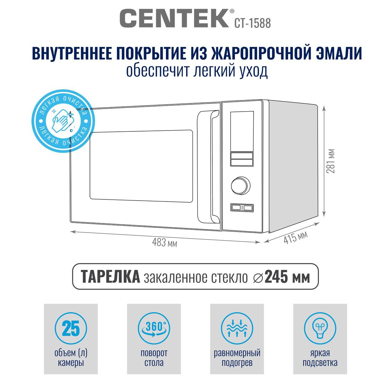 Вы можете купить Микроволновая печь Centek CT-1588 в магазинах М.Видео по доступной цене. Микроволновая печь Centek CT-1588: подробное описание, фото и отзывы реальных покупателей, характеристики, возможность скачать инструкции и подобрать аксессуары.