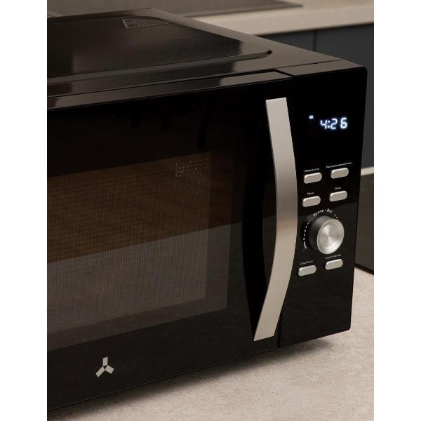 Для выбора настроек используются кнопки и поворотный переключатель, информация отображается на дисплее. Стенки камеры покрыты эмалью, дверь открывается налево с помощью внешней ручки. Прибор снабжен стеклянным поворотным блюдом диаметром 31,5 см. Полезный объем печи — 30 л. Габариты модели — 30,3х21х38,3 см, вес — 13,5 кг.