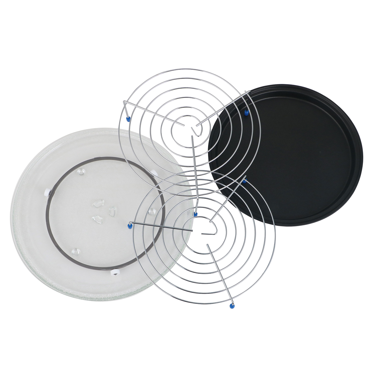 Стенки камеры сделаны из биокерамики, дверца снабжена горизонтальной ручкой, откидывается вниз. Внутри установлено поворотное блюдо диаметром 34,5 см. Печь укомплектована металлической решеткой, блюдом для конвекции. Габариты модели — 52,3х30,9х48,6 см, вес — 20 кг.